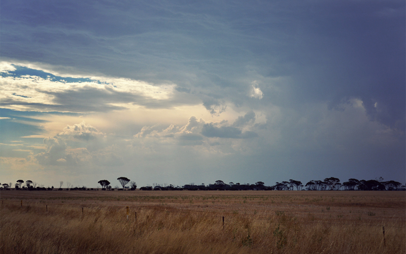 About ten miles from the town of Dumbleyung this theory falls apart and the shit gets serious. Claps of thunder begin to ripple across the countryside every fifteen or twenty seconds. Lightning comes out in force, in all of its forms: crooked bolts, bright shapeless flashes, and wide explosions of light that seem to fan out like an opening palm for dozens of miles in all directions at once. The wind surges and whips the branches of the trees with such power that the world takes on a loud hissing sound that never fades.