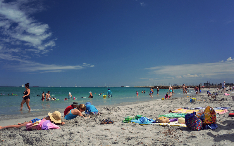 It's a perfect summer morning, and Perth's typical sea breeze hasn't yet picked up for the day, so together with Ric and Anna we head off to the beach. We lay back on bright-colored beach towels spread over pale gray sand and look out on five-year-olds burying themselves, teenagers jumping off a yellow metal pontoon anchored a few hundred feet offshore, and old men bobbing in the shallows with only their balding heads visible. At the center of it all are a pair of Americans with ridiculous tan lines who feel happy and relaxed and content, knowing that for the first time in longer than they can remember there's nothing in particular they need to do.