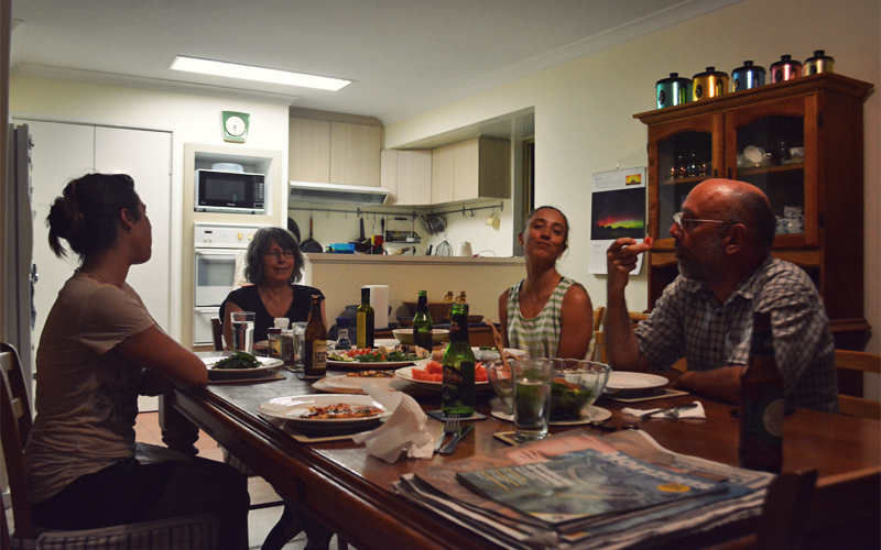 Over homemade pizzas and Australian beer and the smallest bit of salad that's still socially acceptable to eat, we sit down with Victor, his wife Ruth, and his daughter Tia. They're an adventurous, interesting, well-spoken lot, with Victor having traveled the world throughout his life, Ruth growing up in a remote bush community of about thirty-nine people a hundred miles or so north of Norseman, and the two of them raising their daughters in between the South Island of New Zealand and Western Australia. Tia is a skilled surfer who has already seen more of the world than we probably ever will, has lived in Peru long term, and hopes to move to the Los Angeles area some time soon. That we've traveled as far and wide by bicycles as we have comes as no great surprise to any of them.