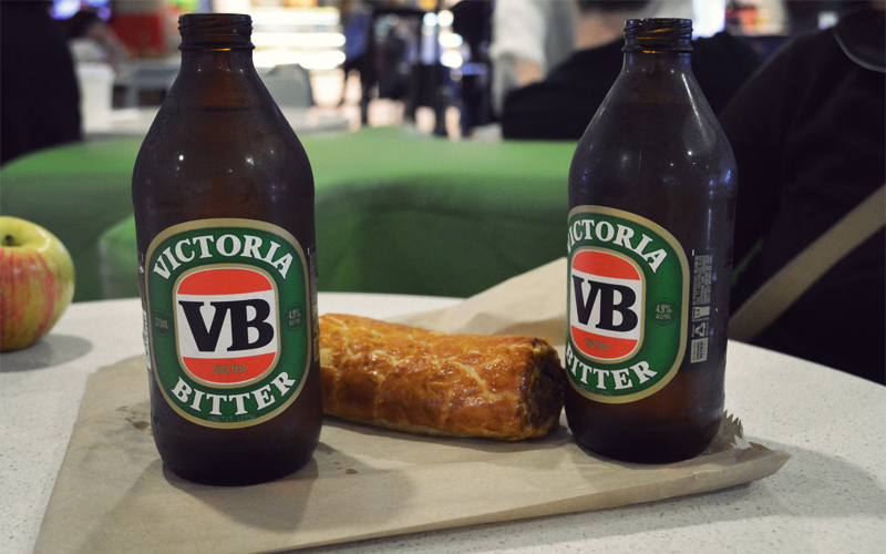 Australia remains interesting and enjoyable until the very end. In the newspaper we learn that we rode across the country during what was the fifth-hottest summer on record. We delight in the fact that when the captain comes on over the intercom and says schedule it sounds like shedyule. When we pass through security to reach the international terminal in Sydney, an agent with a heavy Russian accent looks at my passport, notices that it says United States, and then goes on a five-minute diatribe about how it's a good thing I'm not from Texas, because George W. Bush is from Texas and George W. Bush is an embarrassment both to America and the world. We also have what could only be described as the perfect last meal in Australia: a sausage roll and a Victoria Bitter stubby and chunks of a Cadbury Dairy Milk chocolate bar. They're so compelling that the apple I bought for Kristen the Former Vegan goes uneaten. As we eat, we watch middle-aged people wearing fanny packs without a hint of irony waddle past.