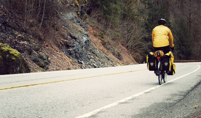 I ride east into the foothills and start to hit some rollers. I sweat like crazy pushing up one side in all of my cold weather clothing, only to freeze everything flying back down the other. The thin sleeves of my bright yellow rain jacket flap in the wind and sound like a pair of helicopter rotors as I hit 30 miles per hour.