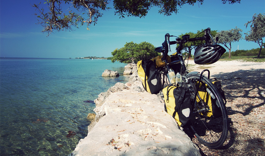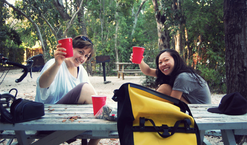 Maybe it was worth it. I take a long shower and immediately feel better about the world. I spend a few hours writing at the library, make some adjustments to the bike, and stock up one day too late on aloe and high-powered sun block. When I get back to camp I share a rum and Coke with Kieu and Sarah, who are set up in the site next to mine and came to the Keys to go diving and escape Los Angeles for the week. And in the evening I order a pepperoni pizza that runs reddish-orange with grease, with slices that droop down toward the floor when I try to pick them up. It's perfect. I almost completely forget about the awful day of riding and couldn't be happier that I'm right here, right now.