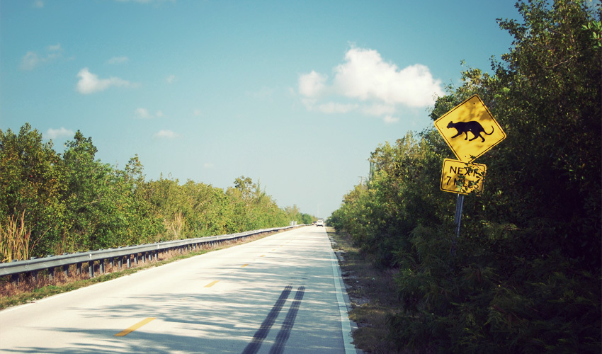 A mile up the road I see a sign warning me to look out for panthers for the next seven miles. Panthers!