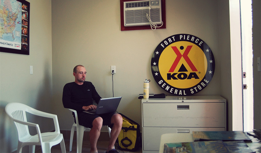 The heat's enough by early afternoon. I stop in Fort Pierce and spend the rest of the day writing, sending emails, taking pictures, and rehydrating. I'm working in the laundry room around 10:00 when Barry, who owns the campground, comes in to close up for the night. He's a genuinely kind man with a great smile, a calm manner of speaking, and a modest New York accent. I ask him if I can stay a bit longer to keep working and he says yes. Ten minutes later he comes back to check up on me, bring me a fresh apple and plum, and wish me good luck. This place is a KOA and it's ridiculously expensive for a tent camper on a bike, but on this day it's given me everything I could want.
