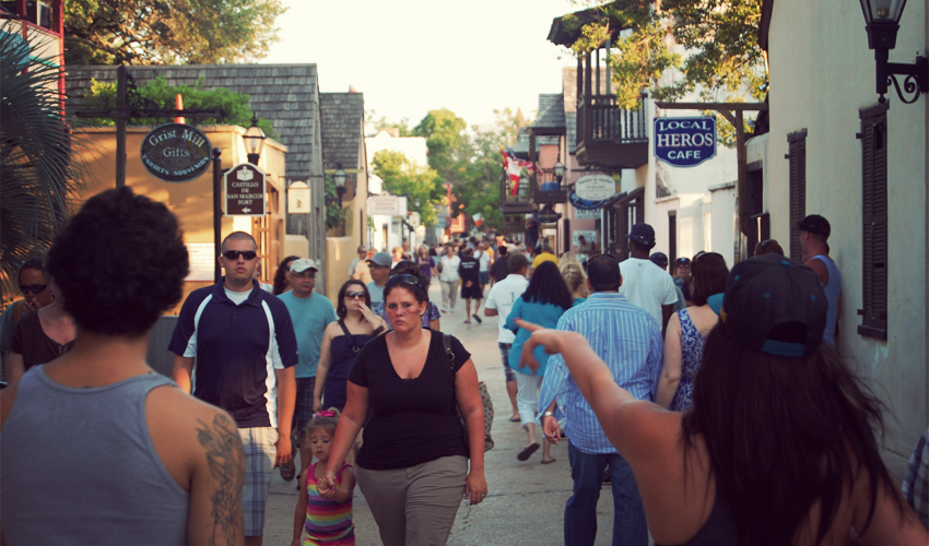 It's Saturday night and the place is swimming with people. Strollers run over my toes and I see a few parents keep track of their children by putting them on a leash. Families and large groups of friends walk five-wide down the narrow and packed St. George Street, their heads tilted slightly back and their mouths hanging open a little. BMW and Volvo SUVs speed madly through the streets looking for a place to park. Horse-drawn carriages clomp slowly past.