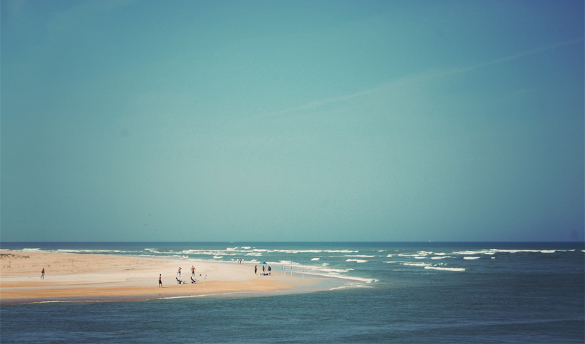 Soon I'm back at the ocean and there's nothing in the way this time. The colors, sounds, and smells of the coast are all around. A light blue sky draws down into dark turquoise water, which crashes as roaring waves into the beach that shines white and yellow with tiny bits of orange. People swim, surf, and body board as the wind blows in a constant rush from the southeast and carries along with it the strong smell of salt water. Both locals and tourists are out on the coast this afternoon, fishing, laying in the sun, and building sand castles.