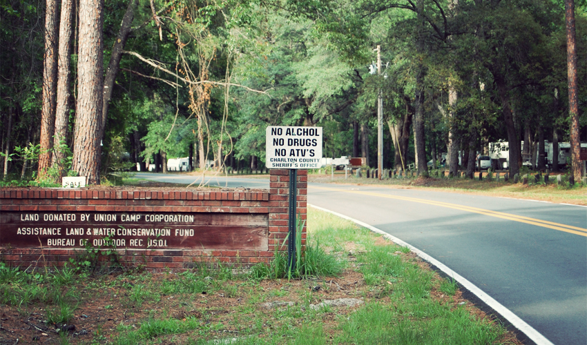The road out of Kingsland runs perfectly straight for several miles, curves slightly to the left or the right, runs exactly straight for several more, and continues on like this all the way to Folkston. Skinny pine trees line the left side of the highway for much of the afternoon. At first they look natural, like they've been there forever. But when I pass them at just the right angle I see that they sit on a grid, aligned in precise, evenly spaced rows. Now that I've crossed the state line, the Florida Gators front license plate covers I've seen for the last week immediately change to the Georgia Bulldogs. There aren't nearly as many cars, either, and they all give plenty of room. Instead of a breeze off the ocean I get still air, humidity, and pouring sweat.
