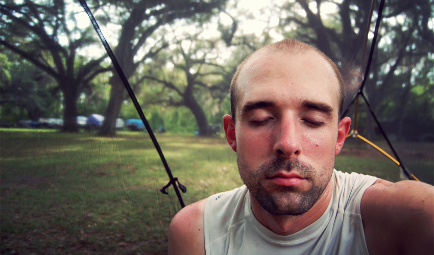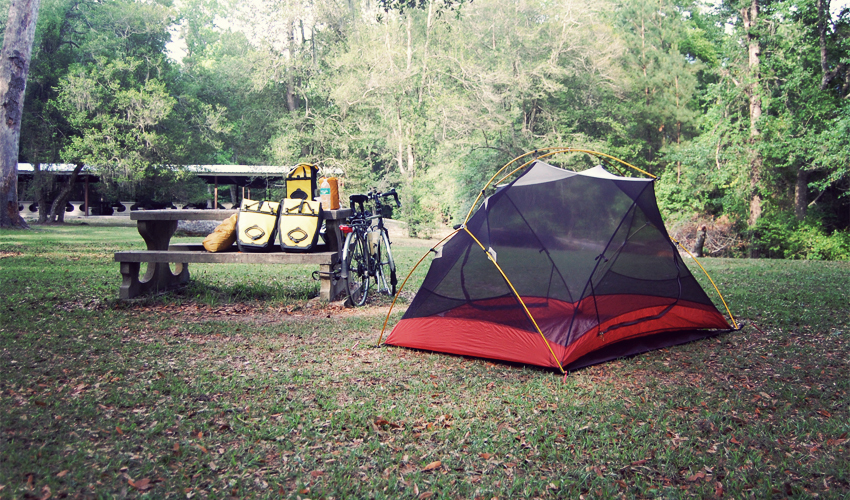 I leave Folkston in the late afternoon. The temperature sits just below 90. When I reach the campground five miles out of town, sweat runs down everything: my forehead, all sides of my neck, the center of my chest, the top of my butt crack, and from the upper part of my knees all the way down to the cuffed edge of my soaked socks. As soon as I stop the bugs are all over me. I set up the tent and throw all of my gear inside as quickly as I can, swatting wildly at my head and arms and legs the entire time. I sit dripping in the tent for the next 45 minutes.