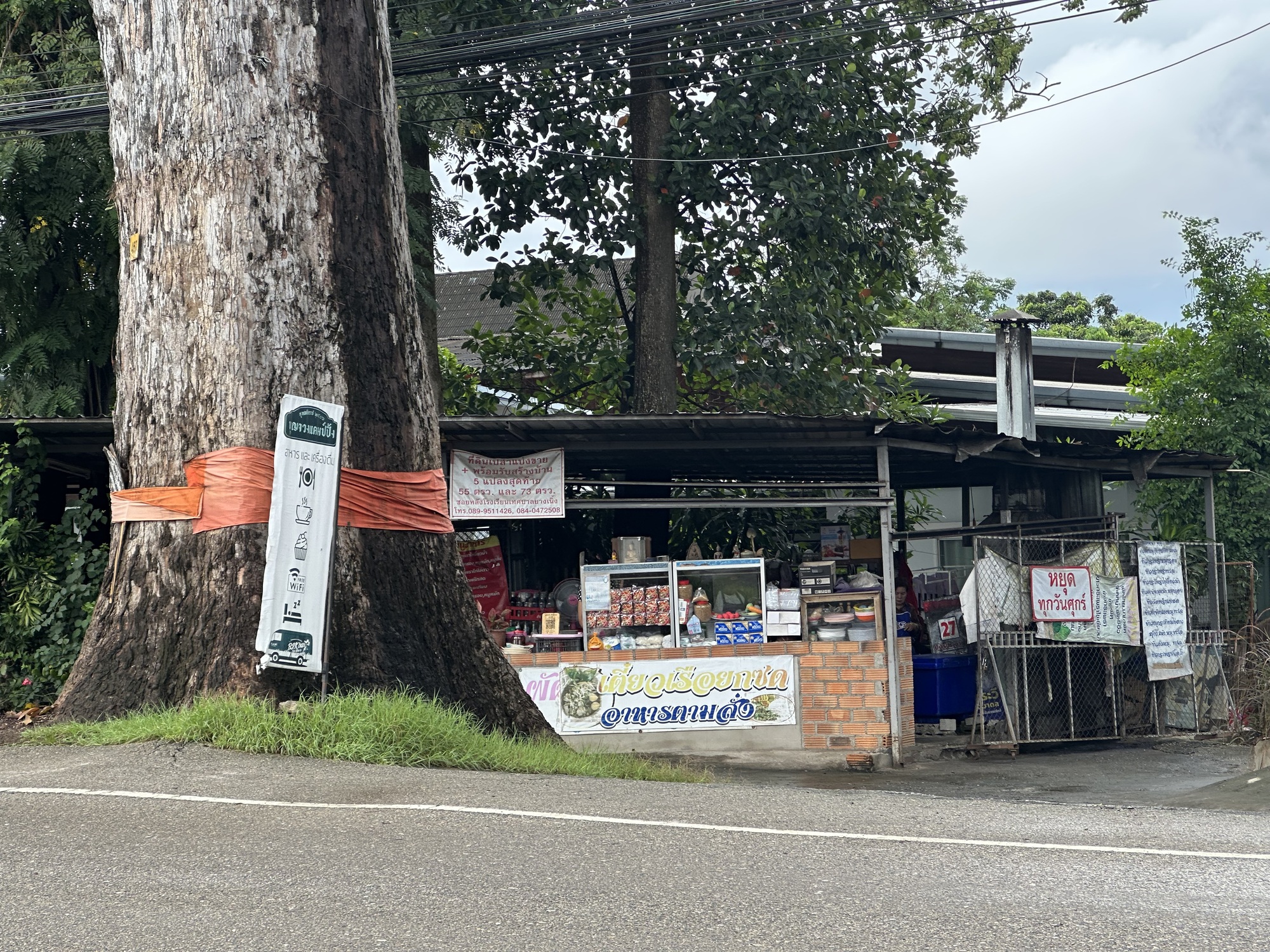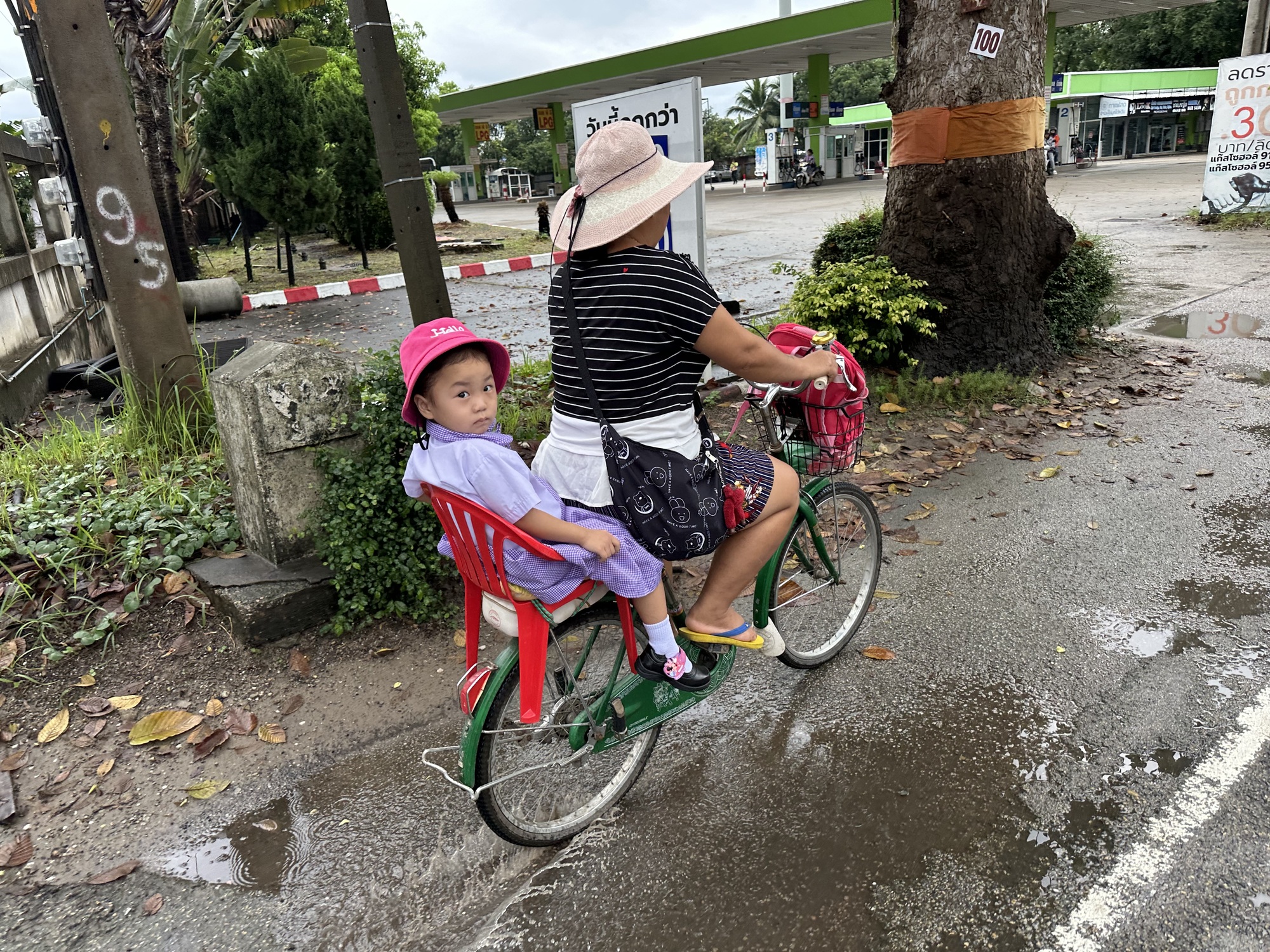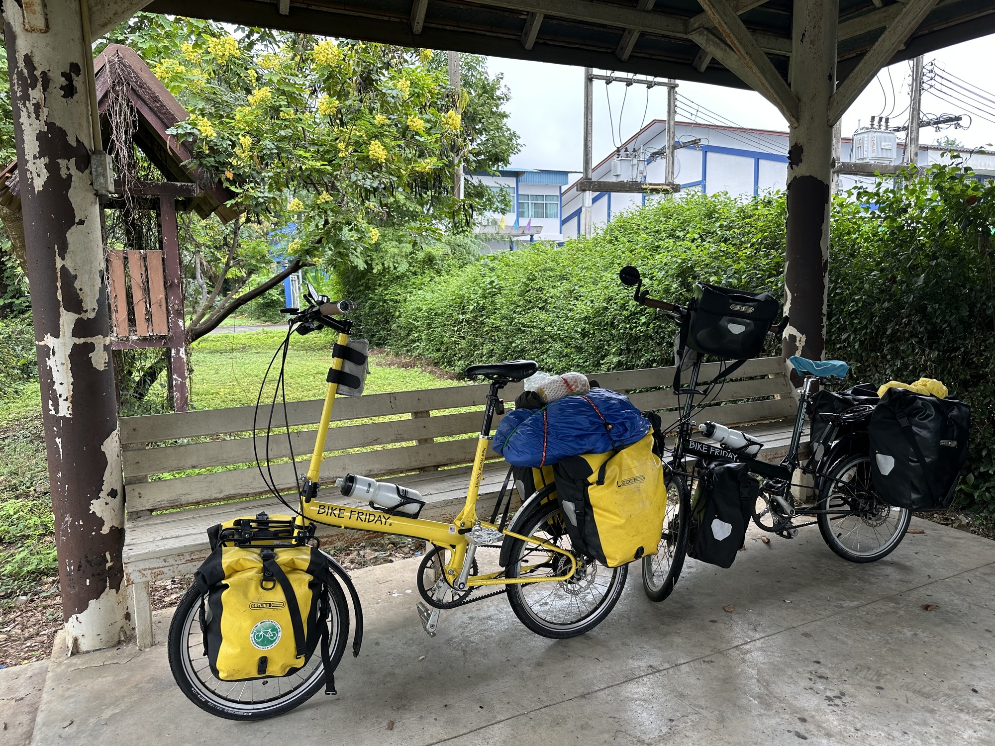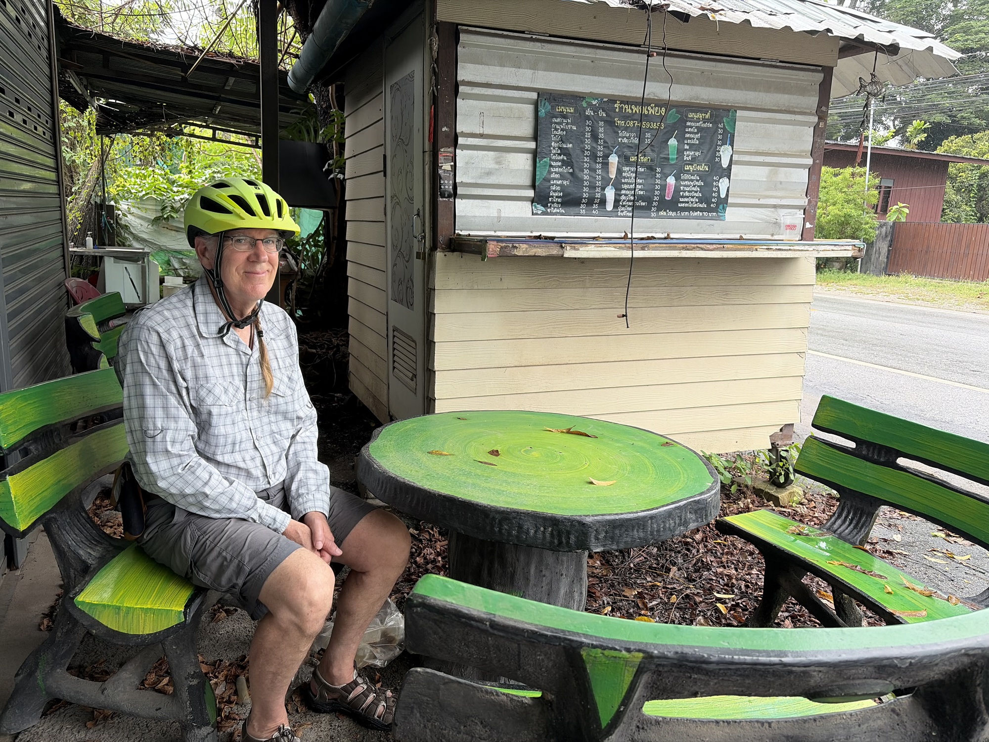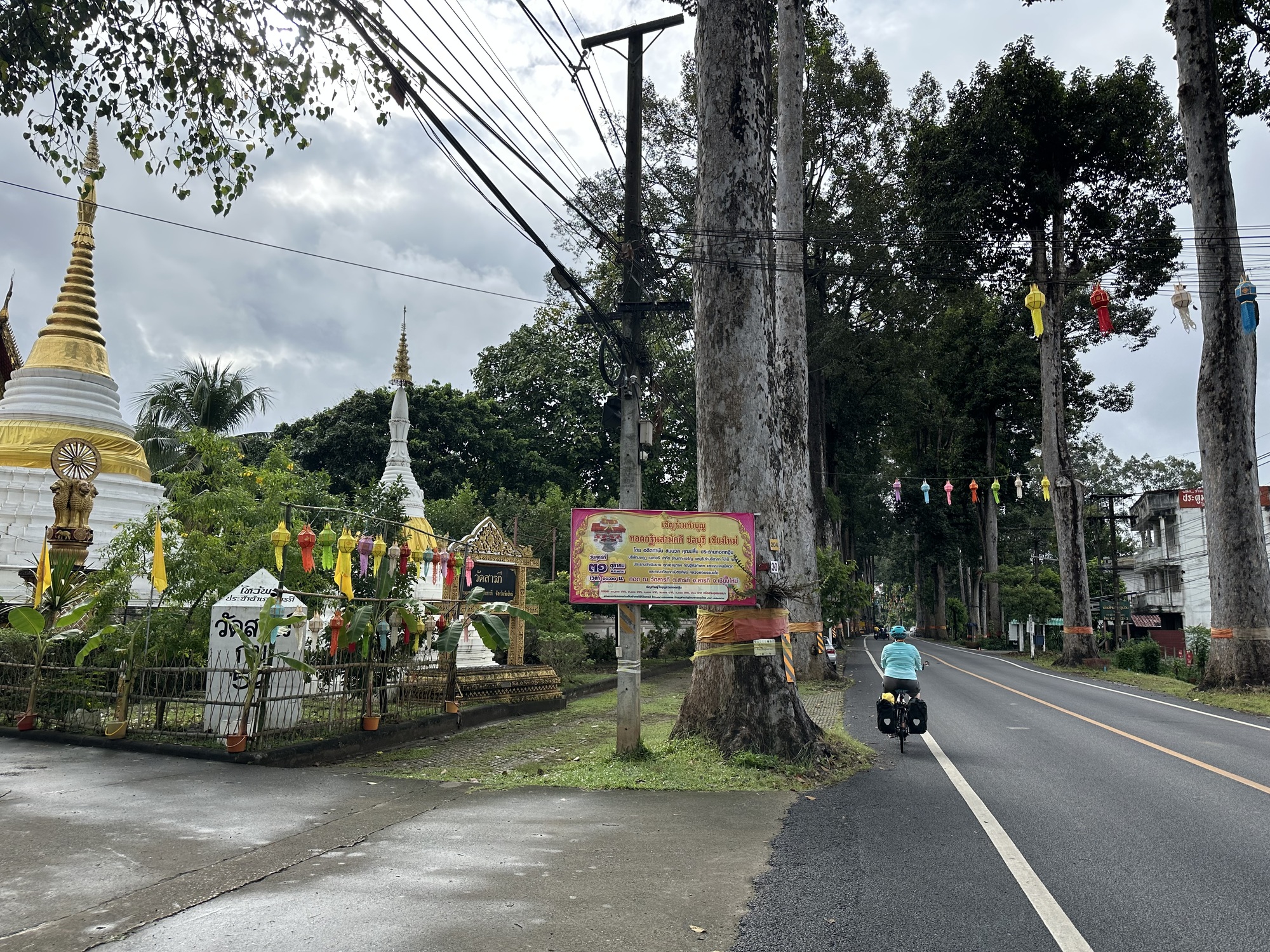 Not gonna lie, and it’s no secret that I’m in rotten shape, no excuses. This ride was the perfect first day ride, flat, short, and a fun Thai road. But after the trees petered out there were still 4 miles to go and I was petering out too. The rain started again so we stopped at a covered roadside shelter, these are all over Thailand and we love them, and called my grandson who was relaxing before bed with his mama and papa. He wanted to see all around us. Why was it morning there? It’s night here. He was full of curiosity. He told me he was going to rake leaves at my house with Papa (my heroes!). And that he wants to see the candles floating down the river that we’re going to film for him.