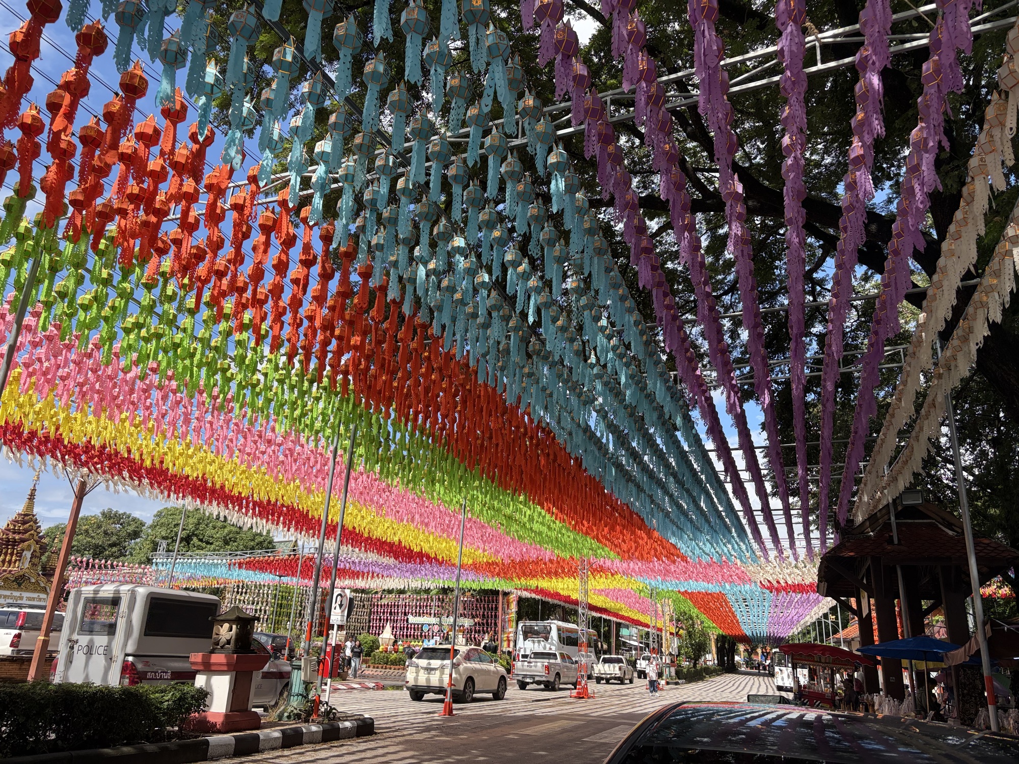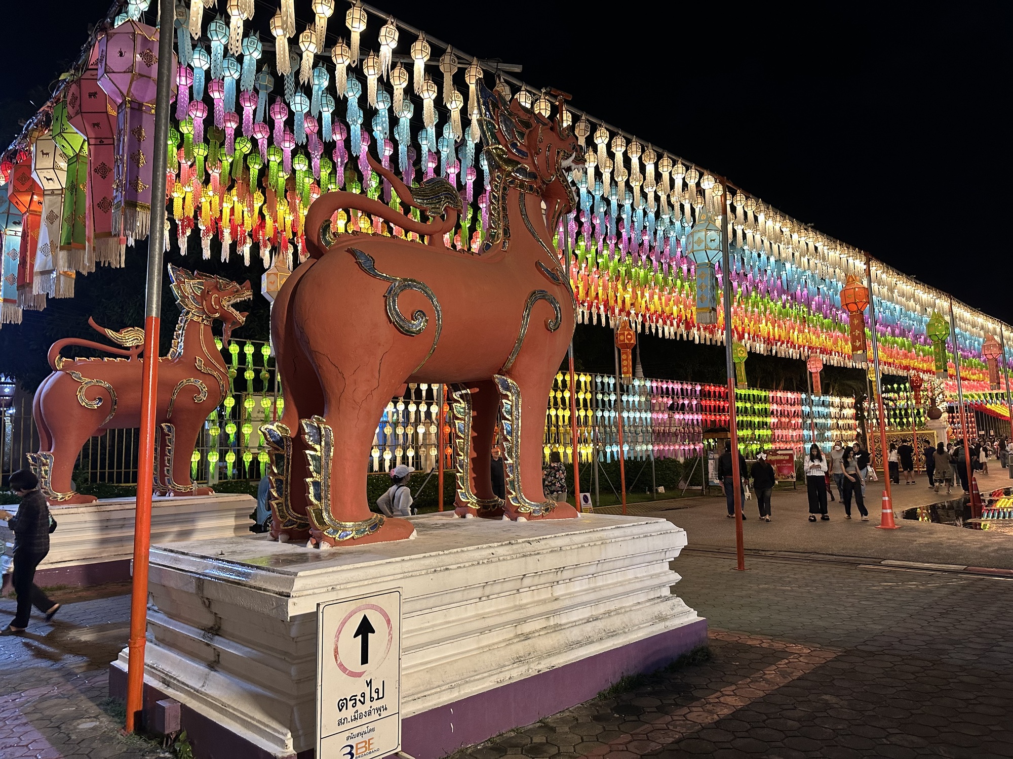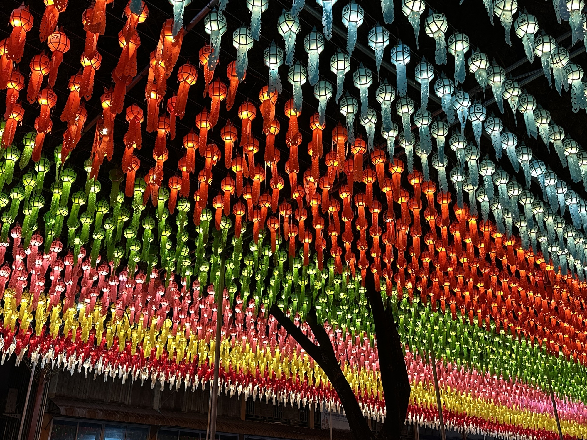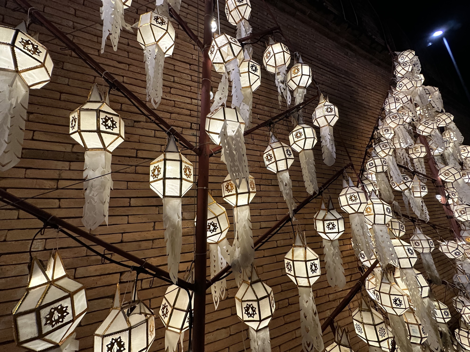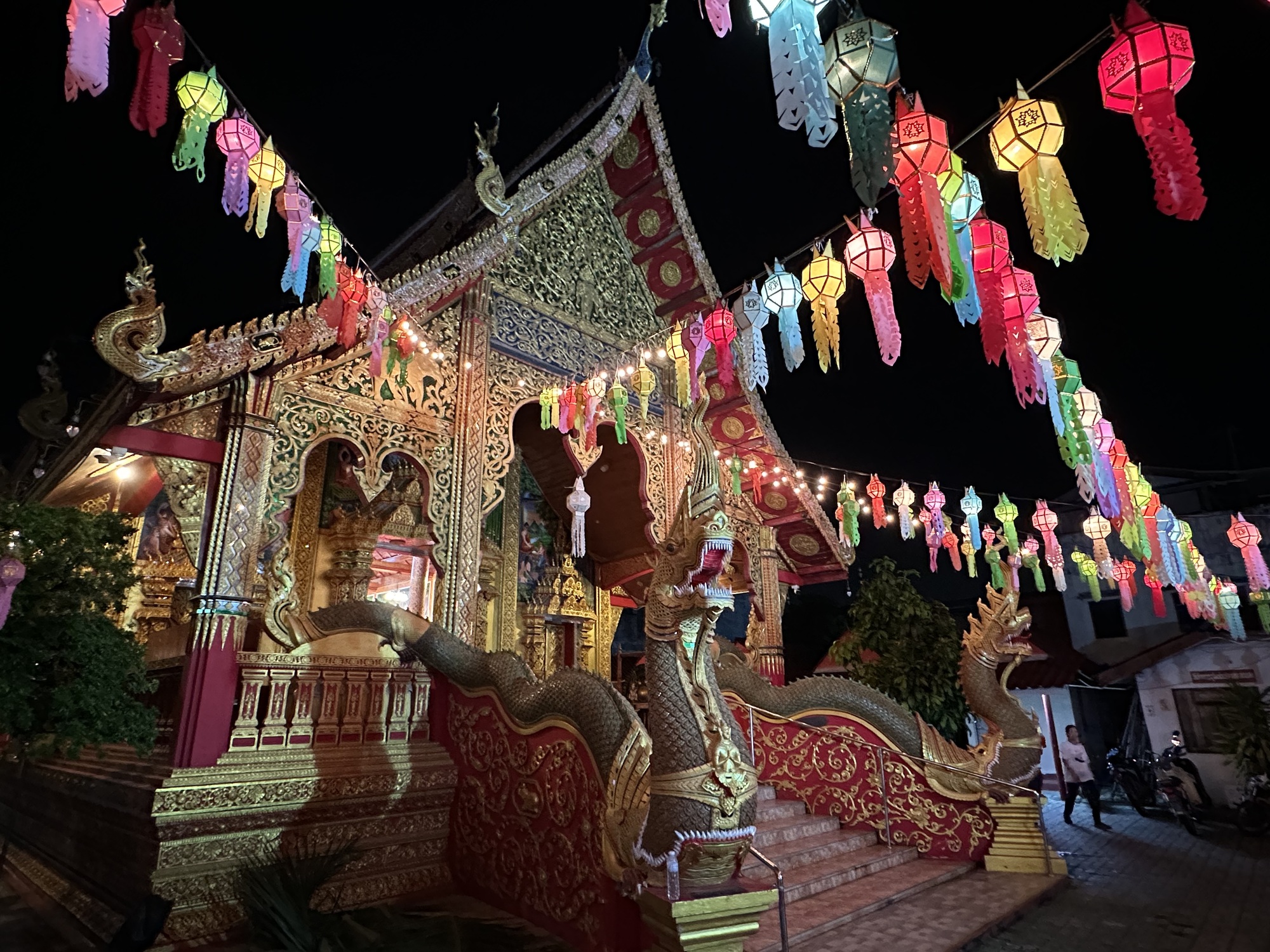 We arrived at our guesthouse mid-morning. It’s a lot nicer than the hotel we stayed at here three years ago. The owner speaks perfect English and went to school in Wisconsin and Rhode Island. We like Lamphun and rolled into town to our favorite coffee shop and sat at a wooden bar that faces the river. The town is all dolled up for its famous lantern festival. I’d read something about lanterns in Lamphun, but wasn’t prepared for the spectacle, it’s jaw-dropping. I don’t even know how to describe it so we’re going to have to just use photos.