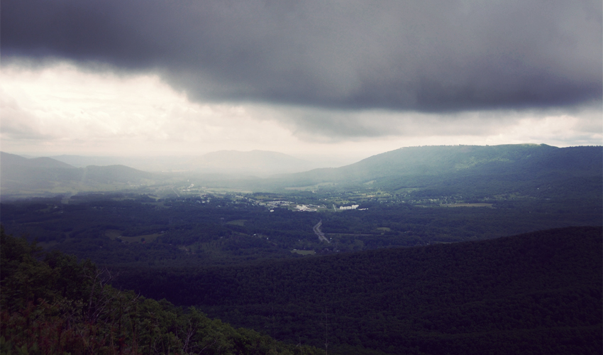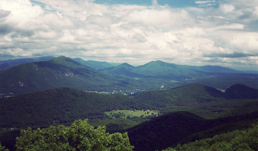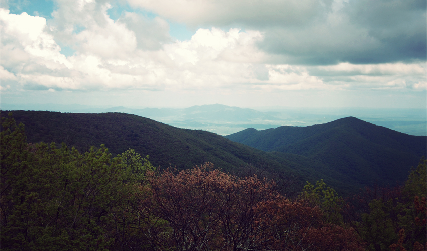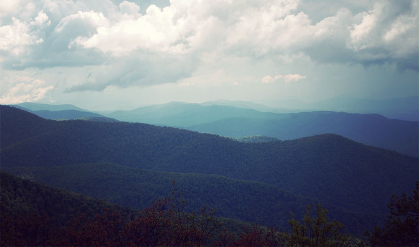 When the ridge cuts out of the trees it opens up views of a large valley at least a thousand feet below. Farms break up broad sections of trees along the valley floor. The surrounding mountains now stand shorter when compared to the huge peaks I saw farther south. Clouds turn to rain and then into sunshine within 15 minutes. The Parkway intersects with the Appalachian Trail a couple of times during the morning and I pass several through-hikers, their beards thick and full, legs strong and toned, and upper bodies ridiculously skinny and weak from two months of non-stop walking in the woods. Dennis and I ride slowly, well behind everyone else.