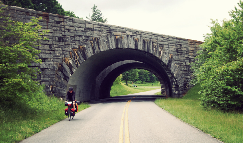 I take a break at an overlook that used to sit high above an untouched mountain, but now looks down upon a couple of strip malls and a Lowe's. As I sit and make notes, a guy on a loaded bike rides up the Parkway from the south and pulls in.