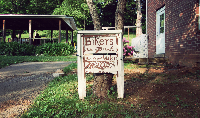 When I pull up to the Elk Garden Methodist Church I see Chris sitting and reading in the porch swing. The guy's got wheels; he's been there for hours. Our riding styles are different, but we both agree that the free camping in the welcoming parks and churches along this stretch of the TransAm are awesome and make every day a little bit better.