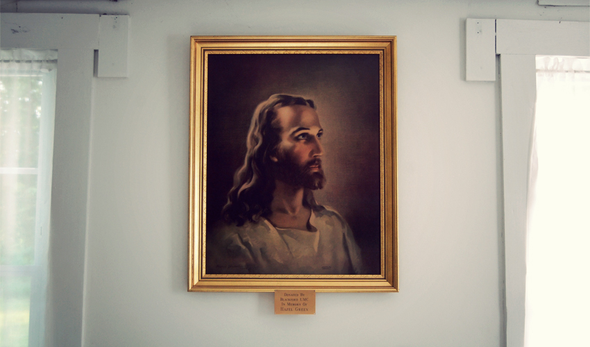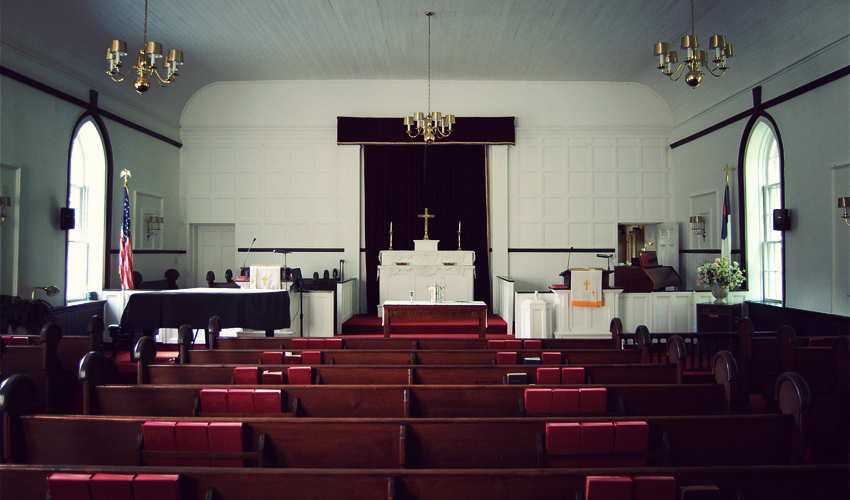 Chris decides to sleep outside in his tent, underneath the picnic shelter. I choose to set up inside in the sanctuary. Soft red carpets line the floors and the three short levels of stairs that lead up to the altar. A line of dark-colored wood stands three feet high and rims the room. Everything above that line, including the ceiling, is painted pure white, and when I look closely I can see the ridges that mark the end of one plank of wood and the start of another. Six narrow windows—three on the west wall, three on the east—rise eight feet tall before arching to a point at the top. The place holds ten rows of uncomfortable, creaking, wooden pews that run in three lines, the middle one wide and the outer two only large enough to hold four people each. A silver jug, cup, and plate sit up front on a white tablecloth, which drapes over the top of a table engraved with the words "In Remembrance of Me." A golden cross lies at the center of the altar, backed by a dark purple curtain with gold trim.