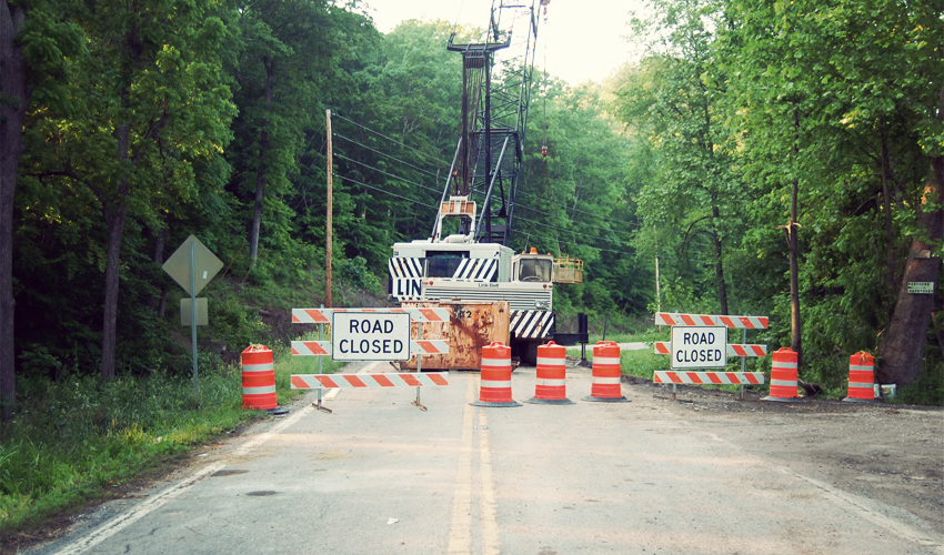 I ignore the Road Closed warning signs and continue riding west. I've pedaled almost 2,400 miles without taking a detour and don't plan on starting now. Then I reach the bridge—or the place where the bridge used to be. Barricades block the way and a huge crane sits silent, holding a large section of concrete over the narrow, shallow river that runs quietly below.