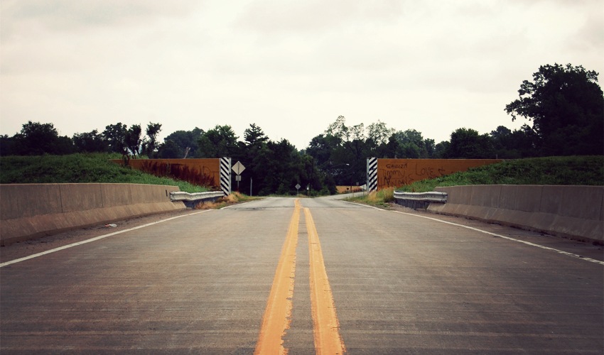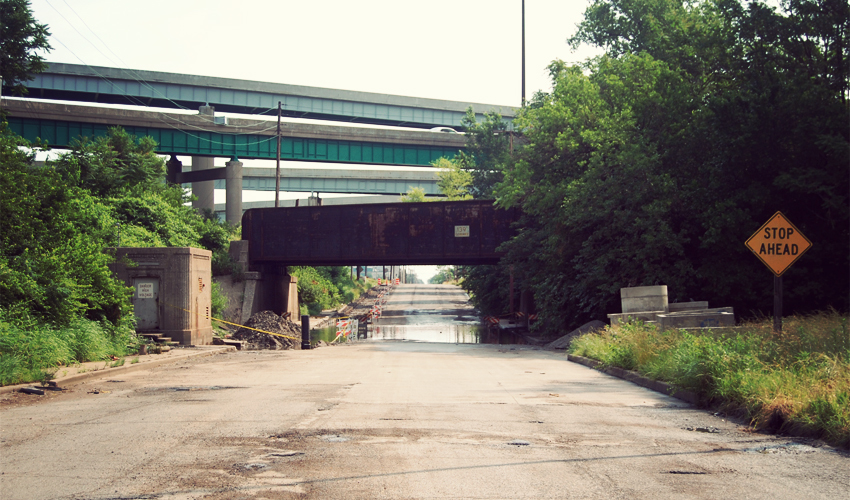 The highway dumps me off onto a side road that runs along the edge of East St. Louis, the second-most murderous city in America. Post-apocalyptic is too strong a term to describe the place, but just barely. I see no one walking the streets and only a few cars drive past. Some rough-looking homes remain, but most stand abandoned, boarded up, tagged with graffiti, slowly falling apart. It only takes two miles worth of riding to pass through the city, but in that time I dodge at least a hundred potholes. I ride through low stretches of road that sink beneath a couple of inches of brown water that ripples from the wind shooting down from the north. Railroad lines and freeway overpasses cross a hundred feet above my head. A guy in an old Buick almost runs me over because, hey, fuck you and your bike, white guy.