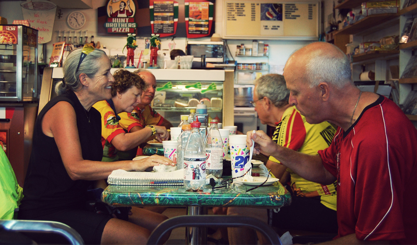 We make it to the Lizard Lips Grill & Deli under the first drops of rain from an oncoming thunderstorm. Diane, Tim, Janet, Frank, and Steve the van driver all roll in within ten minutes. No sooner does the last person walk through the door then all hell breaks loose. Lightning blasts from every direction. Huge cracks of thunder break directly overhead and shake the walls. Rain falls at a 45-degree angle in torrents, blurring the view of the field just across the highway. The group lets out a collective gasp when the power cuts out, followed immediately by a cheer when it flashes back on.
