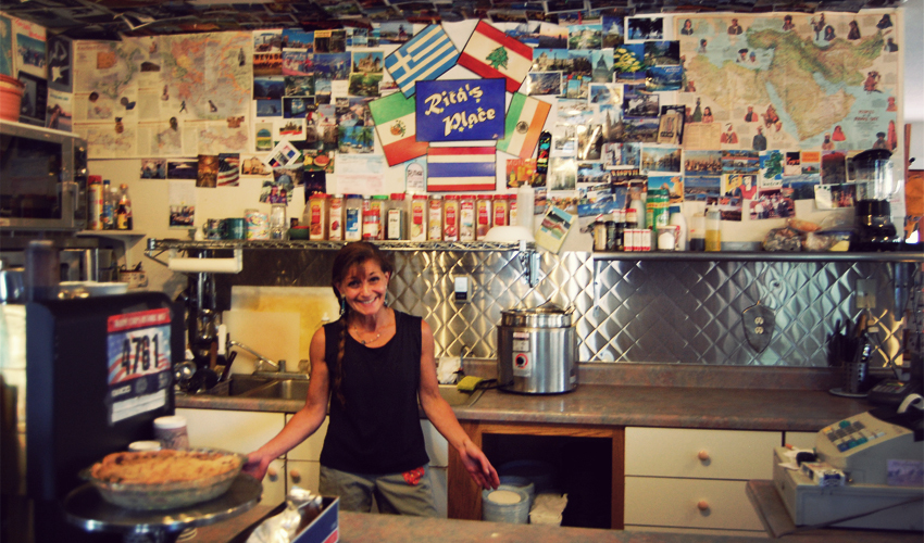Before I walk out the door she loads me up with some gooey baklava, a piece of Amaretto cake, and a bright green apple, purely out of kindness. I also get a huge hug and at least half a dozen wishes of good luck and safe travels. It's so genuine, so honest, and it's the last kick I need to get me over the hump. I feel fully re-energized and ready to cross the West and reach the Pacific. As I walk out the door and down the steps, Rita asks me to find Carl and tell him to come over and help her clean up the cafe. I tell her I will—and then laugh to myself as I walk up the road, because I've been in town only two days and I already know who Carl is and exactly where to look.