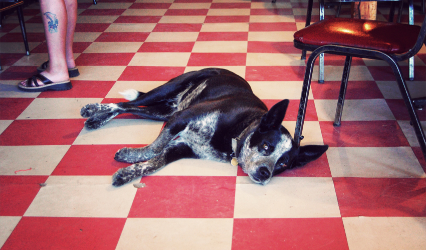 The cafe half of the Split Rock Cafe & Bar is totally empty, so I walk into the bar instead. Country music blasts from the jukebox in the corner as I step over a Pug that sits in the doorway. Animals skulls and deer heads share space with cowboy hats and neon beer signs on the walls. The local customers—all five of them—sit at the bar and smoke cigarettes and drink Budweiser from both bottles and American flag-themed cans. Behind them, spread out in the middle of the floor, lays a 14-year-old Australian Cattle Dog with arthritis named Willis. A sign next to the bathroom gently reminds guys to shut the door when the toilet's in use.