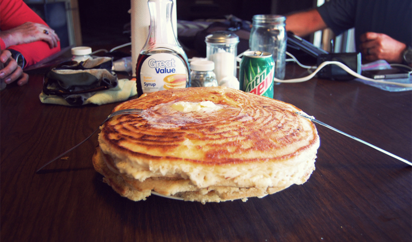 I start around the edges and use my fingers because there's no plate to push down on. At first they're crispy and buttery and delicious, exactly what I wanted when I ordered pancakes in the first place. The bar maid tells me that 7:48 p.m. is my start time—and that only two bike riders have successfully eaten all three by themselves. Each of them took 90 minutes to do it. I don't really expect to set the record, but it seems like I have a chance of finishing. I'm super hungry, after all.