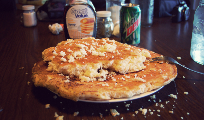 The first half of the top pancake goes quickly, and the second half a little slower.