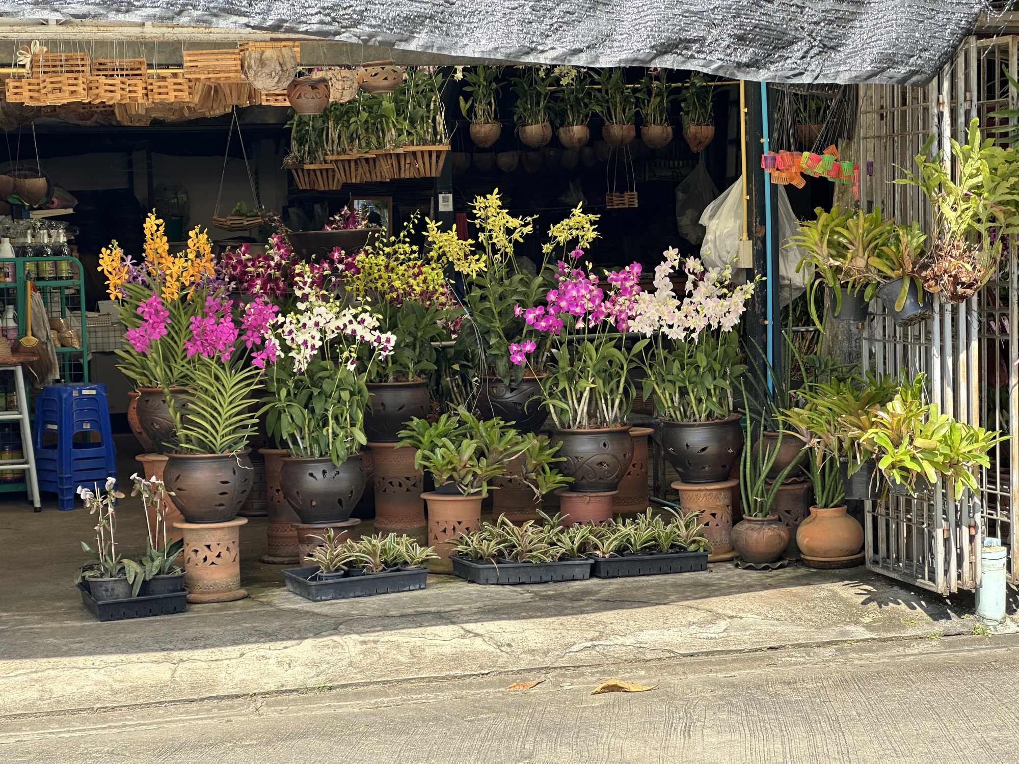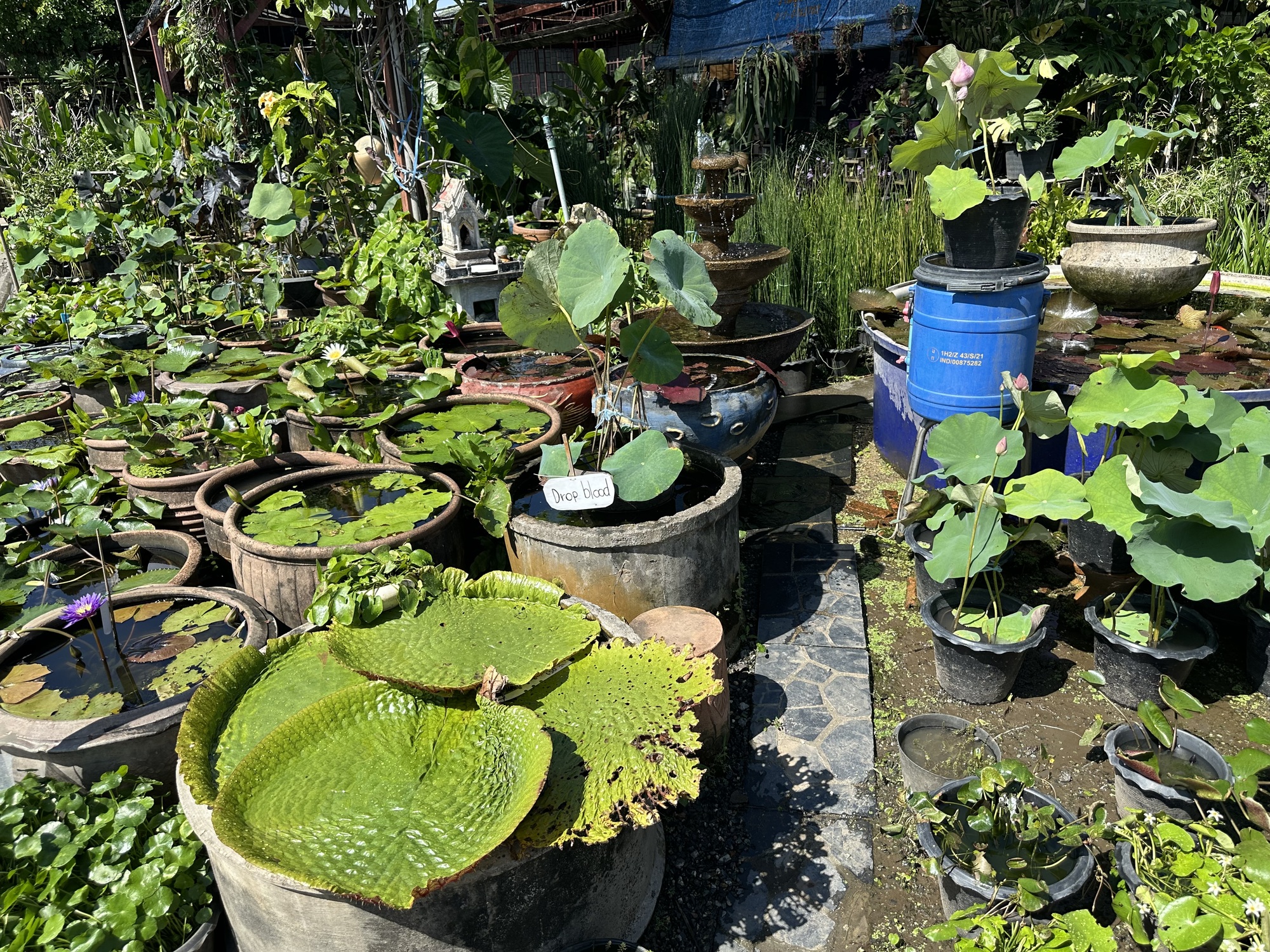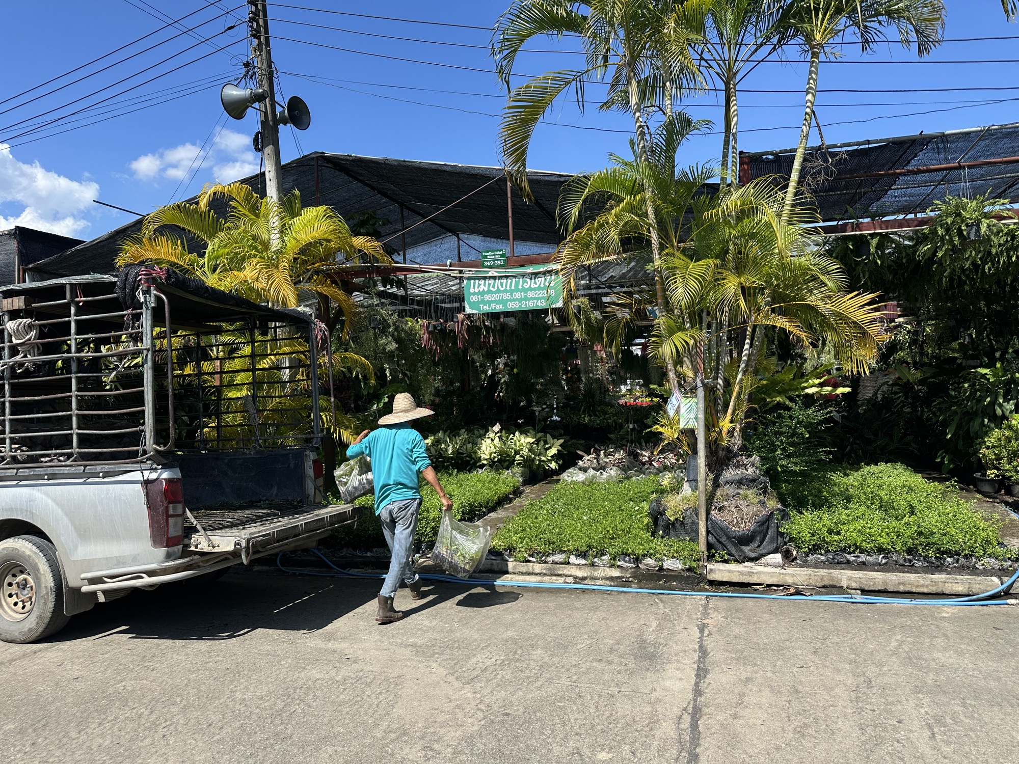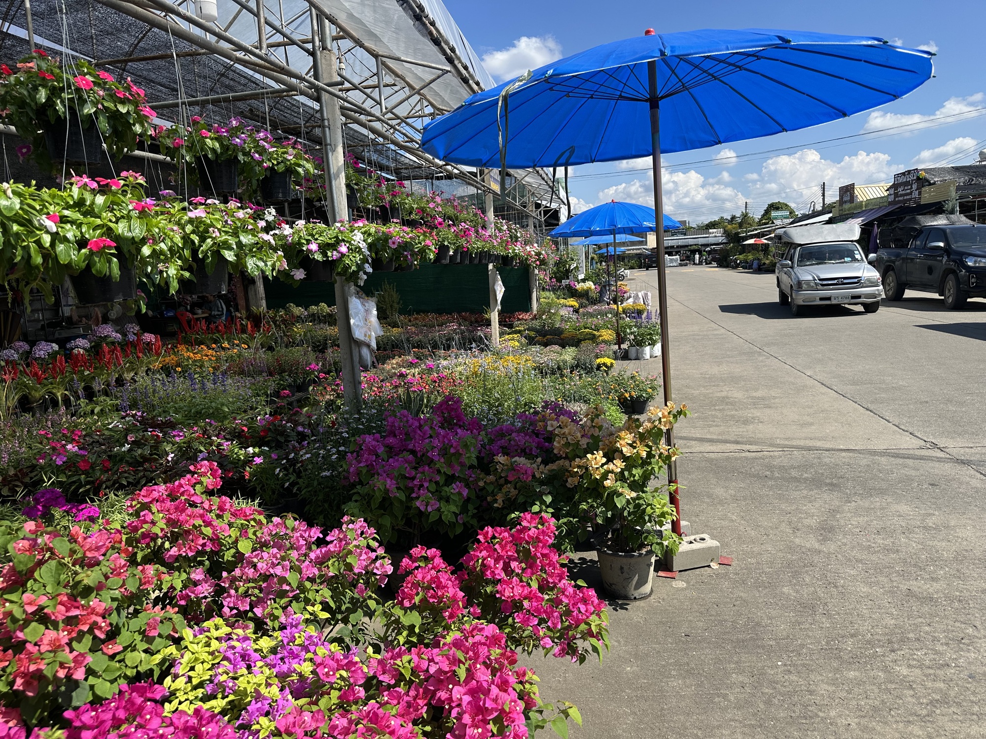 After the market we were in some reasonably sane streets and closing in on Lotus’s. But first, a street of huge puddles! Let’s go a different way. That detour led us into a perfect garden of delights. A literal garden, because there is an enormous market area up in those parts called Kham Thiang Garden Market. It looks to be a fairly recent development, with several widely spaced streets and various plant and garden supply vendors on each street. For people like us, it’s Garden Disneyland!