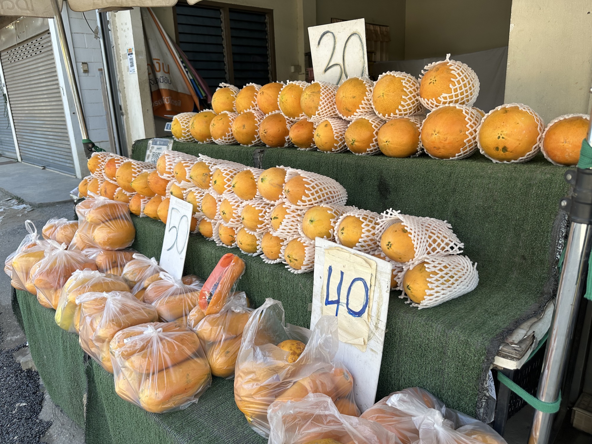 Just a word about Lotus’s. First of all, what a stupid name. It used to be called Tesco Lotus, a brand familiar to those of the European persuasion. Lotus’s has little bodega, 7-11 sized stores in nearly every Thai town but only larger towns have these big department-sized stores at the edge of town. Inside is the large Lotus’s with groceries and things that can be hard to find in Thailand, and clothing and gift baskets and so on. And then a million little kiosks and hole-in-the-wall stores with food or shoes or bras or SIM cards or banks.