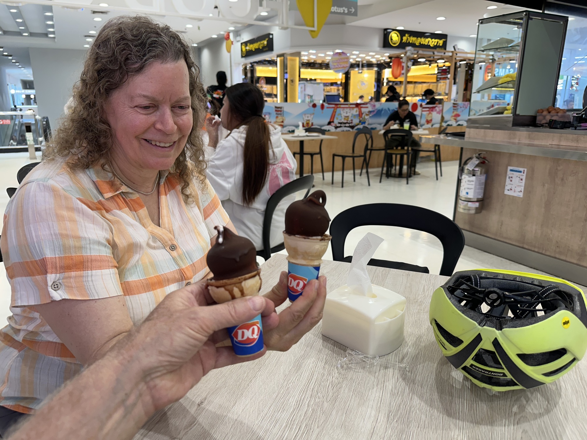 I wouldn’t dream of going to Dairy Queen in the states but here it’s like my holy grail. As we sat in the food court with two new bags of muesli tucked into Bruce’s backpack, I gazed at my tiny chocolate dipped cone and I was back on Dakota Avenue in Libby, Montana. We lived two blocks from the Dairy Queen on Highway 2 and our mom had given us 50 cents to get ten baby cones for the family. Yes. There are ten people in my family. The trick was to speed walk with the little cardboard cone holders the two blocks home before the little curl of white soft-serve started to droop, which would make some of us cry, to have a non-curled DQ baby cone. We were forbidden to lick or touch any of those cones. Or drop or spill. We got so good at that. I never in ten quadrillion light years could have predicted that someday I’d be looking at the curl of my cone in a faraway food court surrounded by Thais eating Lotus’s pad krapao. That’s how marvelous life is. You look at your grandkid asking for photos of shrimp and wonder what and where the hell he will see and go in his lifetime ahead.