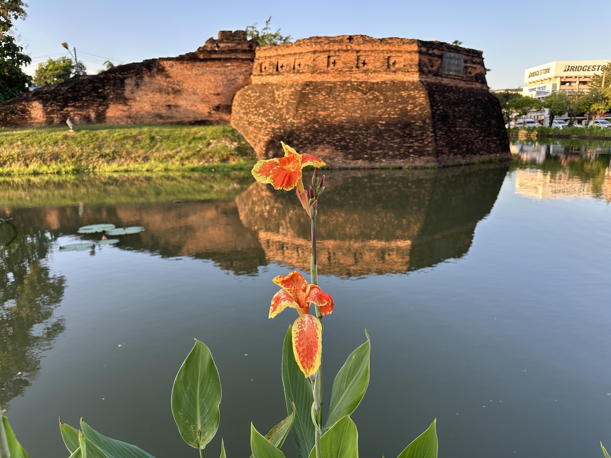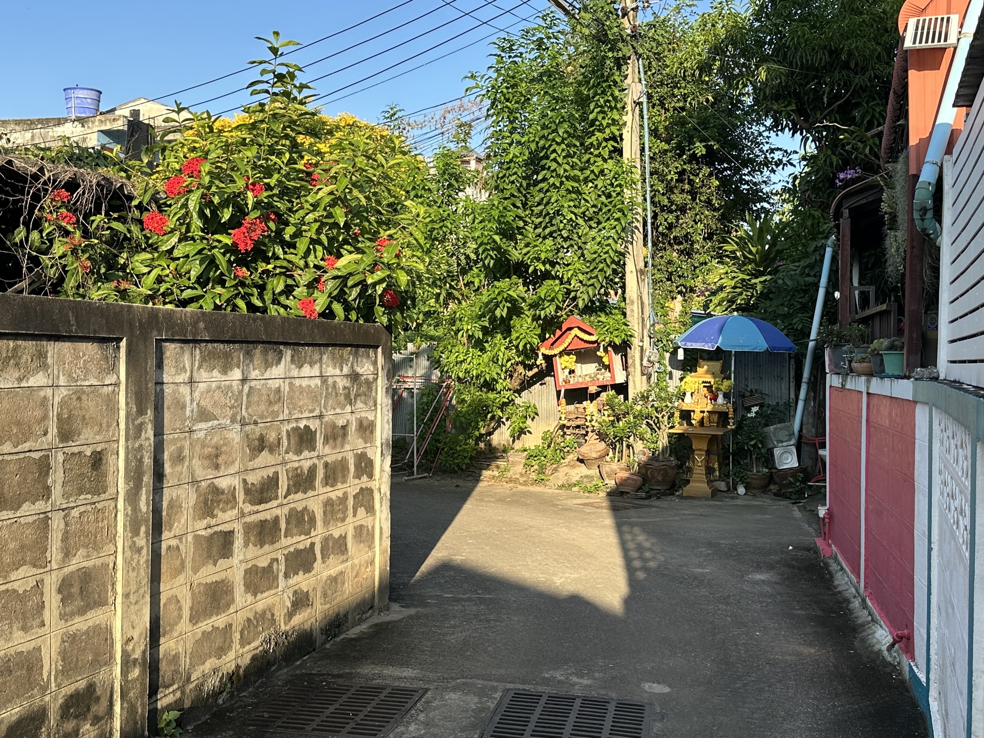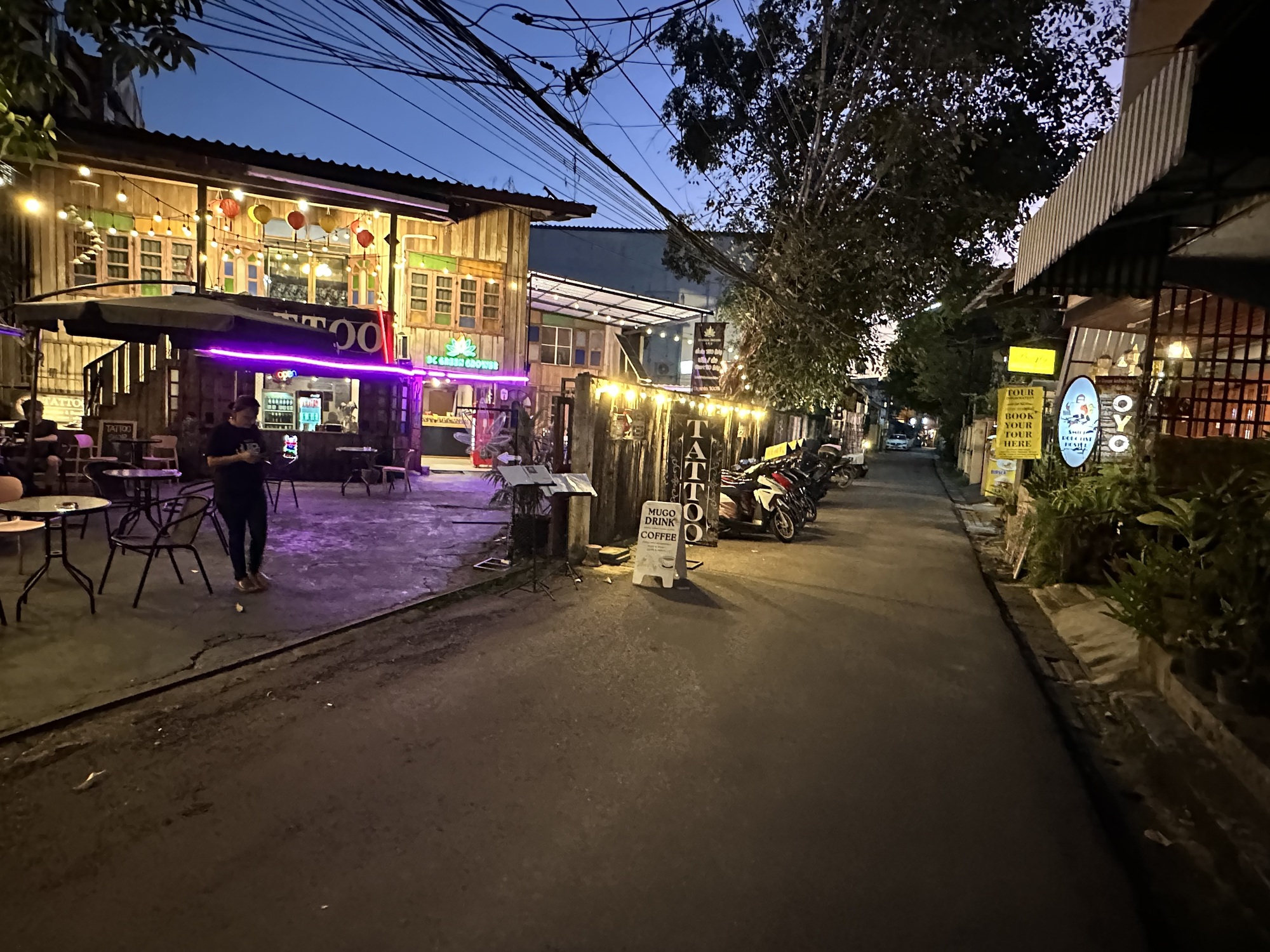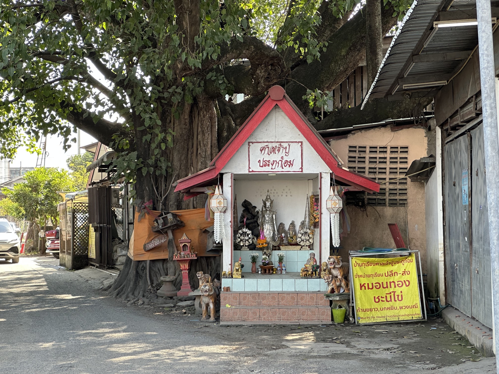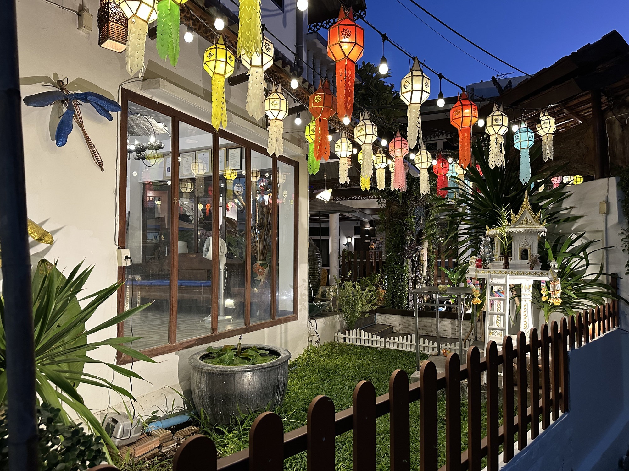 This neighborhood we’re staying in has been a revelation and previously completely unknown to us, we’re south of the southern edge of the moat/Old City, and it’s much quieter and less touristed, with neighborhoods complete with huge trees, overgrown vacant lots, small barns with water buffalo and chickens just yards away from chi chi ‘poshtels’ and tattoo parlors. I’ve always liked the lack of zoning in Thailand. Old next to new, rural tucked into urban.
