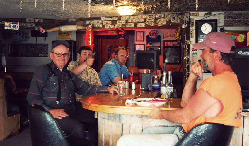 Three guys sit at the bar, all in hats. John's in his early 50s and wears a thick salt-and-pepper mustache and goatee combination, with an orange sleeveless shirt, dirty light blue jeans, and thoroughly worn cowboy boots with frayed gold laces. After a divorce he moved to Montana from the Northwest because he needed to get away from everything and always wanted to be a cowboy. Now he lives and works on a ranch ten miles up the road. Next to him is Mack, who's somewhere in his 70s. He's heavyset, wears thick glasses and a plaid-patterned green shirt, and has his gray pants held up with suspenders. He's from Dupuyer and there's a decent chance he's never lived anywhere else. Near the end of the bar is Pat, who's in his late 40s or early 50s and has the makings of a handlebar mustache. He wears a yellow and brown checkered shirt paired with blue jeans and talks slow—less in a way that sounds like he was born with mental problems, more like he took a solid whack to the head somewhere along the way as an adult. He's also an in-town local.