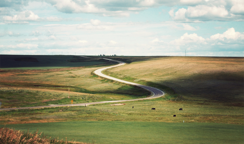 Past Bynum the world explodes with color, as the sun causes the greens, yellows, browns, and reds of the subtly textured hills to glow brightly and stand out in stark contrast to the blue sky and pure white clouds. All around the grass ripples in waves and swishes loudly in the gusts of wind that continue to get stronger. The farther I go, the more elevation changes I run into, and the road starts to climb and fall and twist and turn in response. I celebrate when the wind shifts to the side and then curse a little every time it turns back against me. It turns back against me a lot.
