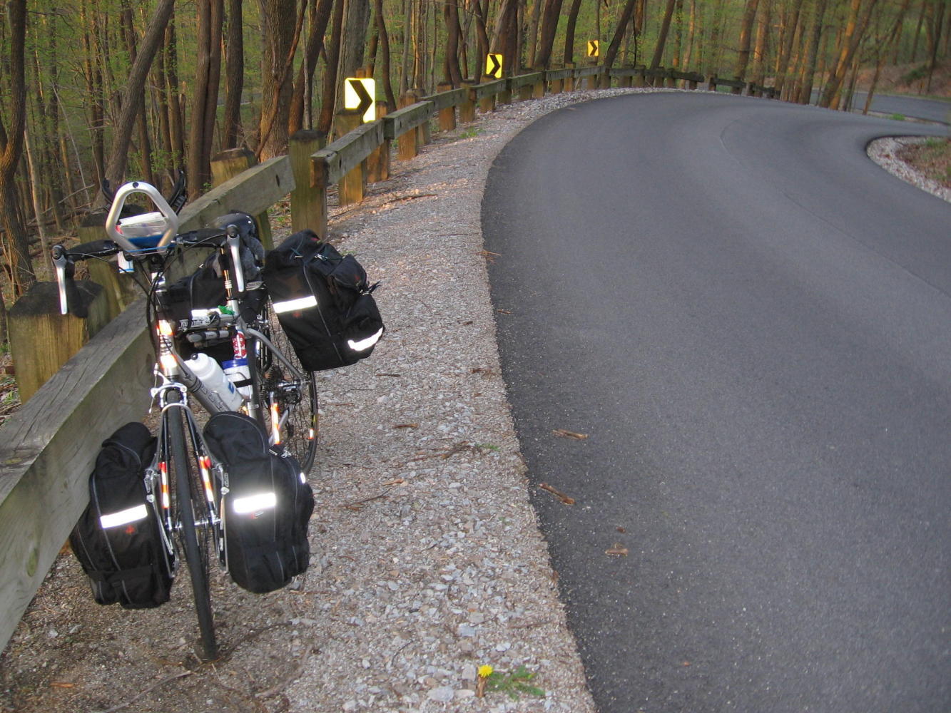 1.18 miles. That's how far I got before I had to walk my first hill--well, part of it anyway. And then when it wasn't so steep, I couldn't balance the bike long enough to get it going again. Well, I did want to practice starting on hills--guess I have to remember to shift to a harder gear before I hop off. At least I didn't go backwards. I've had dreams about going so slow I end up going backwards in the Appalachians. It was a hill I could have probably made unloaded, so I've decided I'm just going to ride across the country naked. And no tent. Just my amazing tyvek tarp/bivy/toga. Yeah, that's it...a tyvek toga.