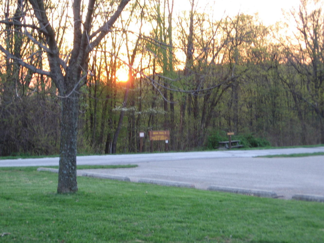 I left my car at Abe Martin Lodge in Brown County State Park around 7:30 p.m., thankful that Indiana had moved to daylight savings time, giving me enough time to unload there and ride the miles to the campground. The final closing of the trunk, after checking four times to make sure I had my keys, was a bit ominous...THUD. Whatever I have with me is all I've got for the next few days. I guess my car's only 5 miles away as I write this (and DOWN the big steep hill), but I don't want to chicken out now. I've got my route for the next three days highlighted on gazateer pages. Not huge miles, but enough to be challenging with some of these hills. And with time to do a little work, too.