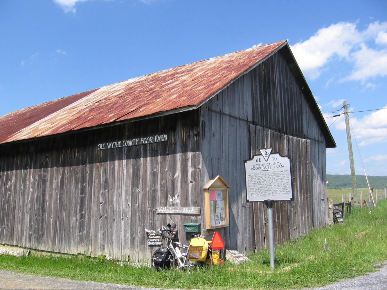 I had lunch at a beautiful wayside (Carter? Collins? C-something anyway) on a frontage road after Grahams Forge before heading on to Max Meadows. Max Meadows to Wytheville was tough--stopped and gave some business to a wood-countered country market in Max Meadows rather than the gas stations at the interstate a couple of miles earlier, but the wind was thwarting my efforts to move forward at any type of reasonable pace. I stopped at a miniature horse and donkey farm along the way just to get out of the wind for a while, hid behind a bush for some wind relief a few miles later, and behind the barn of an historic "poor farm" right outside Wytheville.