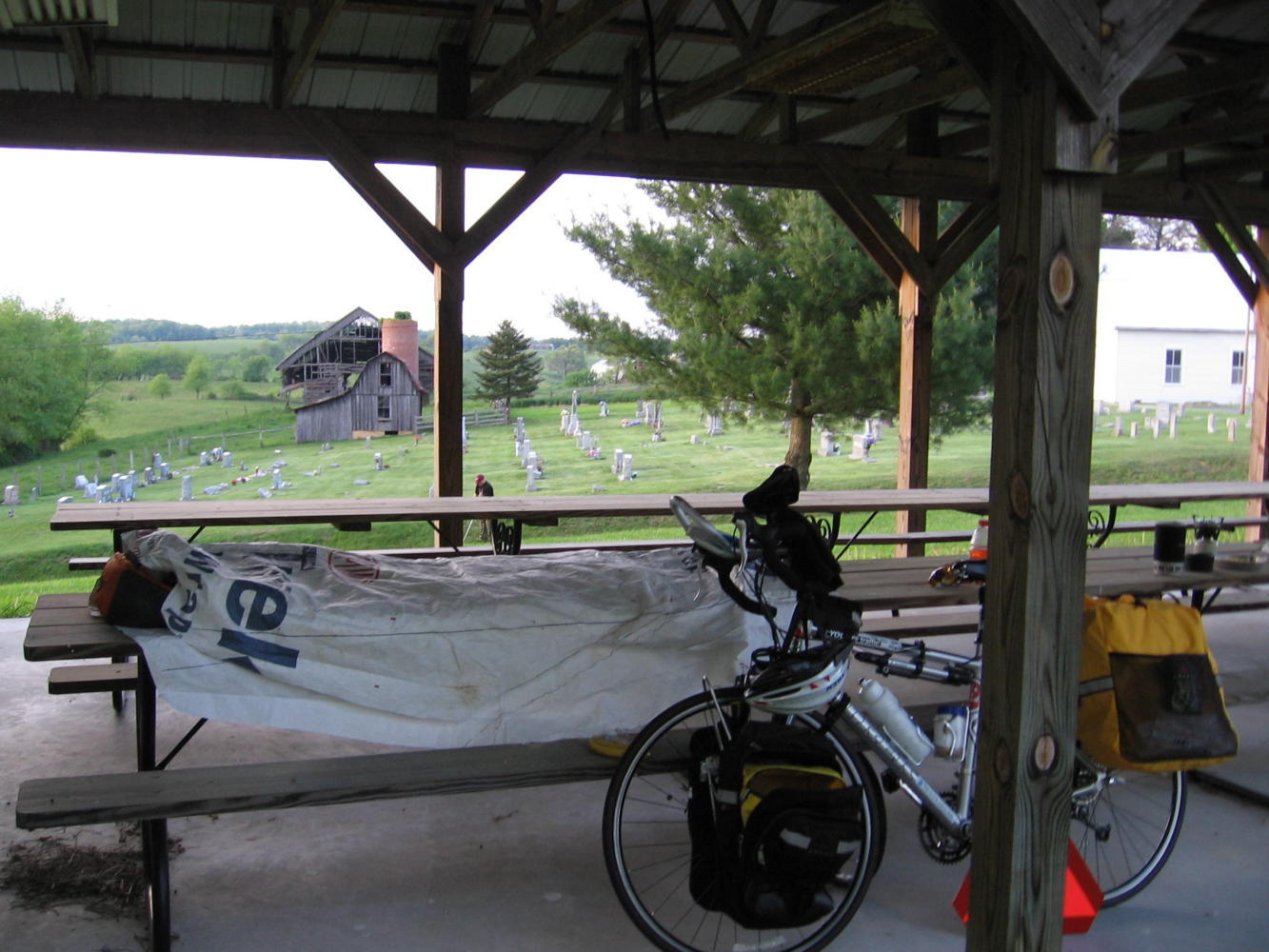 The pavilion was littered with an old bird nest that got too big or too old for the rafters, and there was an auction going on somewhere nearby. The cows kept looking at me and my strange mechanical contraption, but the sunset over the dilapidated barns was worth it. The night ended up being pretty cold, but it was one of the best of the trip so far.