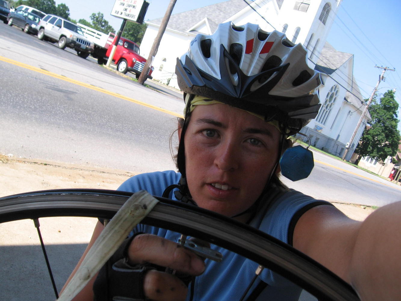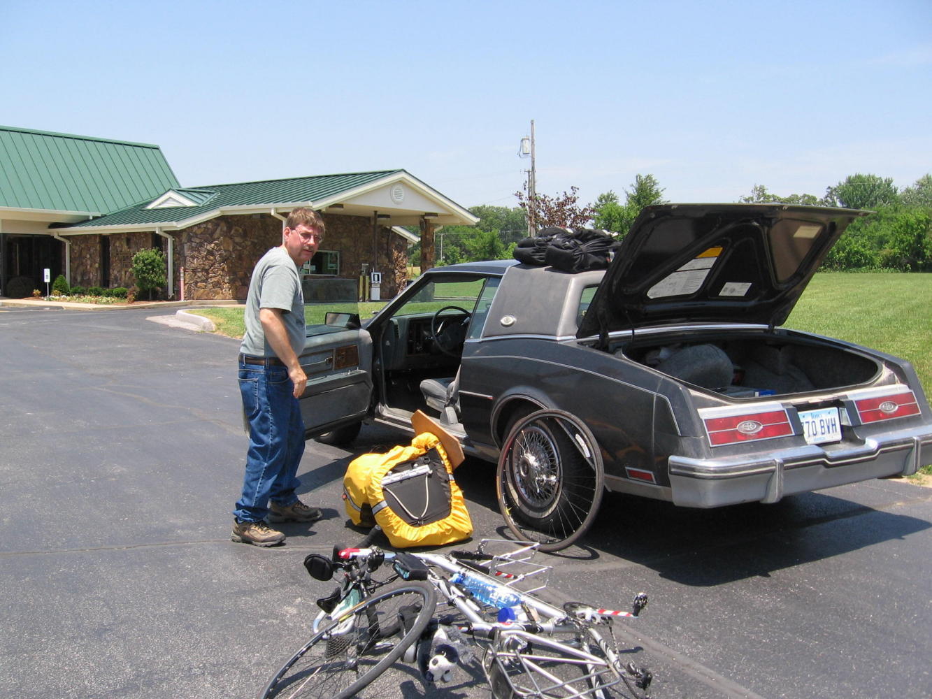 We took Kert apart and stuck him in the car, got addresses for bike shops in Springfield (where we were headed anyway), and took off to get the wheel fixed. The guys at Sunshine Bikes were helpful and did a thorough job on the wheel. I got a new tire to replace the one that was wearing unevenly, and our trip to Bass Pro shops netted me a new camelbak bladder to replace the funky tasting one. I was still in bike clothes, but I was more hungry than anything else, so we went to a steak place. I was so hungry for vegetables, too. And after my hunger was satiated, I was more than happy to hit the hotel room for a shower and a somewhat early bedtime.