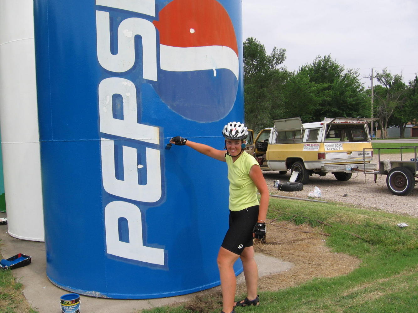 Girard didn't get much of my attention, but I'd been advised to keep an eye out for some large Pepsi formations along the next stretch of highway. Just when I'd almost given up hope of finding them, they appeared at a gas station in Walnut. Large storage tanks cleverly disguised as Pepsi, Mt. Dew, and Diet Pepsi. And they were being repainted. It was my lucky day! The guys handed me a brush and let me join in for a moment (ok, just long enough for the photo op), laughing at my trans-national Pepsi quest. Inspired, I chugged down a Pepsi in the store and headed toward Chanute and a 90+ mile day.