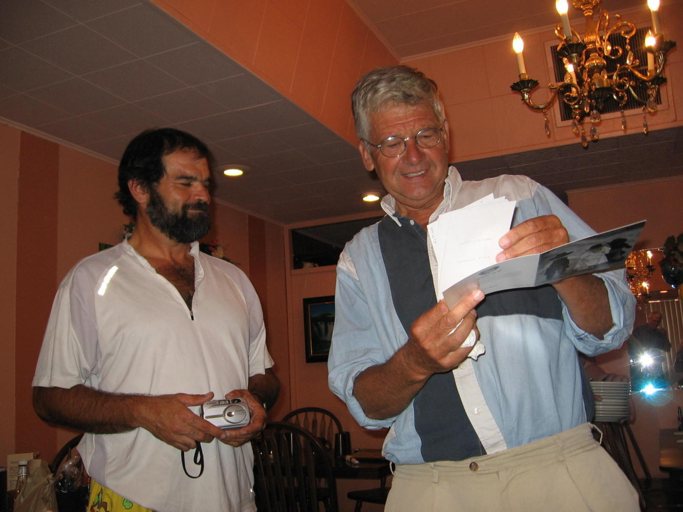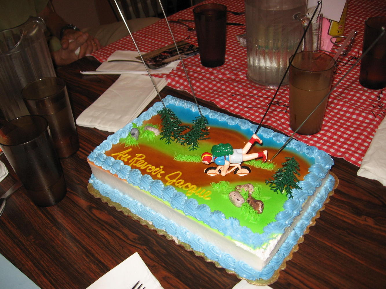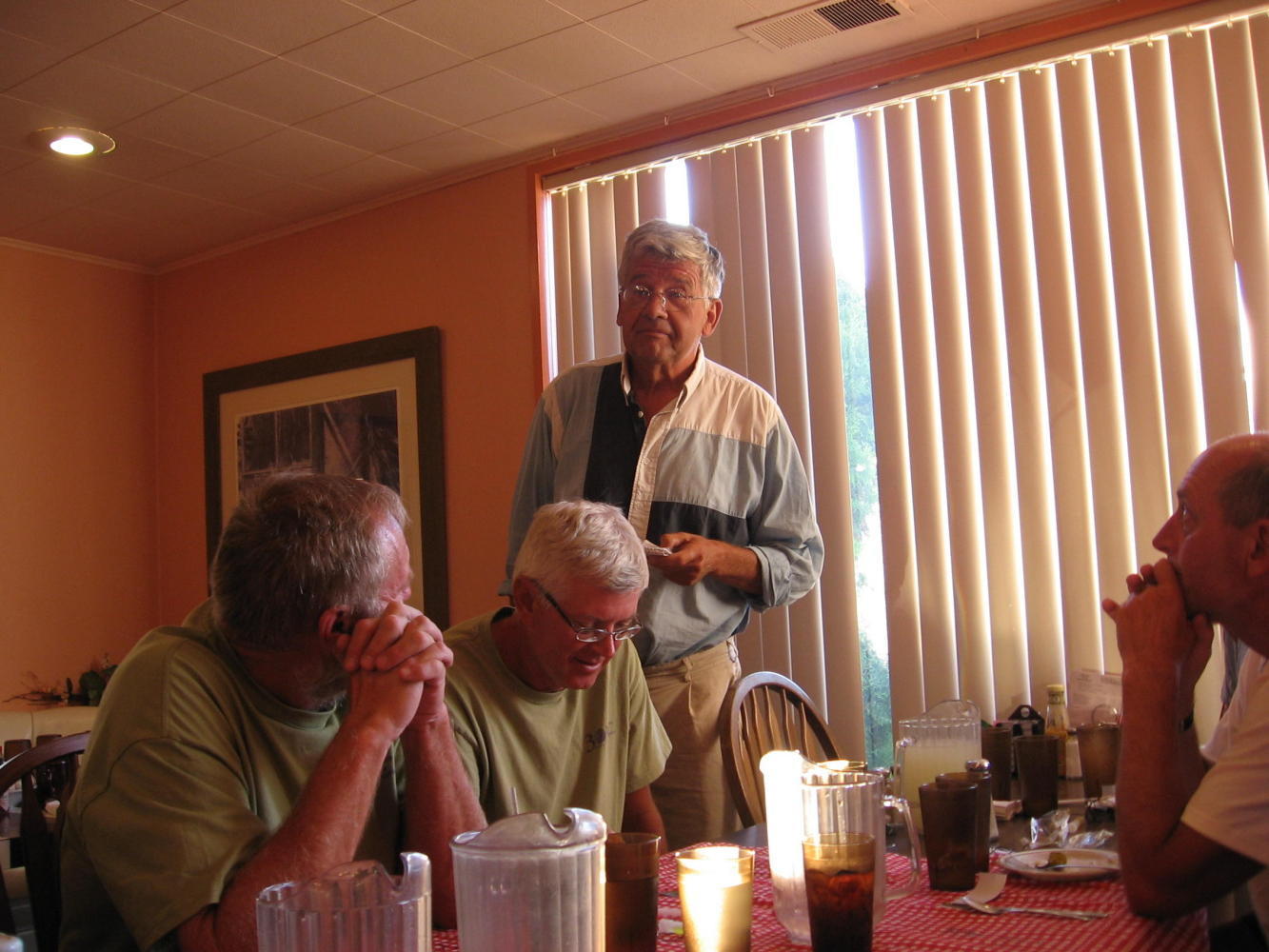 Had some mediocre Chinese food for lunch, sent over 8 pounds of stuff home, so I had to repack panniers. Threw in my laundry with Alvin's, made some more calls, and got ready for Jacques' going away party. The party was wonderful, with Rhonda the miracle worker from the hotel taking care of arrangements for dinner, cake, and gifts for him from Baker City. The group gave him a card and pictures, he made special mention of each person in a toast, and the group shared special memories.
