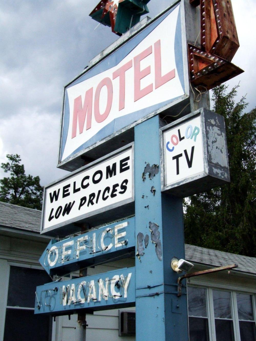 We rode on south along Lake Champlain, looking for the dragits we'd been told we'd see (but not spotting any), on through Plattsburg and its wonderful hippie coffee bar in which I hoped at least one of the many flasks on offer would be hallucinogenic, and then over the start of the hills and down into Keeseville. There, to my great delight, we found a motel still advertising "COLOUR TV". America moves with the times.