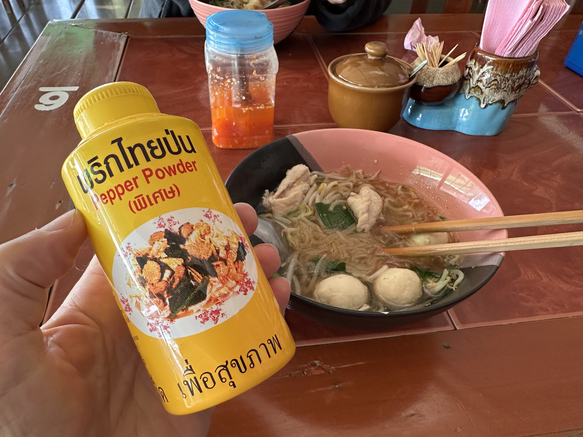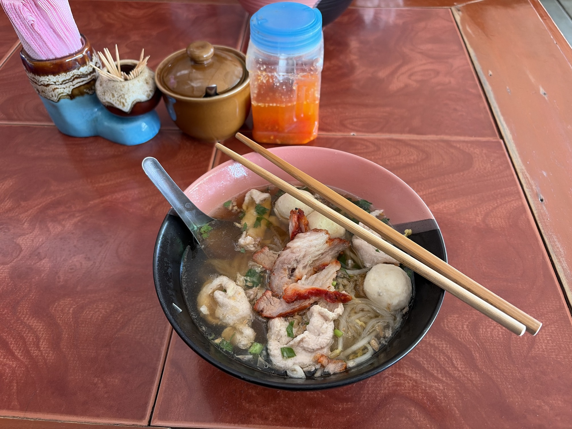 Back on the road we rode through lush Thailand - a smallish green valley, blue hills in the distance and big old trees and farms near to the road. We were riding rollers but they weren't bad. We stopped for some noodle soup. You can pretty much gauge how good the soup will be by how nice the woman who made it is. This certainly was true this time. The three-kinds-of-pork noodle soup and a nice lady. Fantastic food is always better when an excited Thai cook is serving you her speciality. She is full of pride and when we are full we tell her repeatedly how much we loved her soup. This never gets old for us. It is a special experience for us and especially for her because she just doesn't get to serve foreigners on bikes very often, or maybe never before.