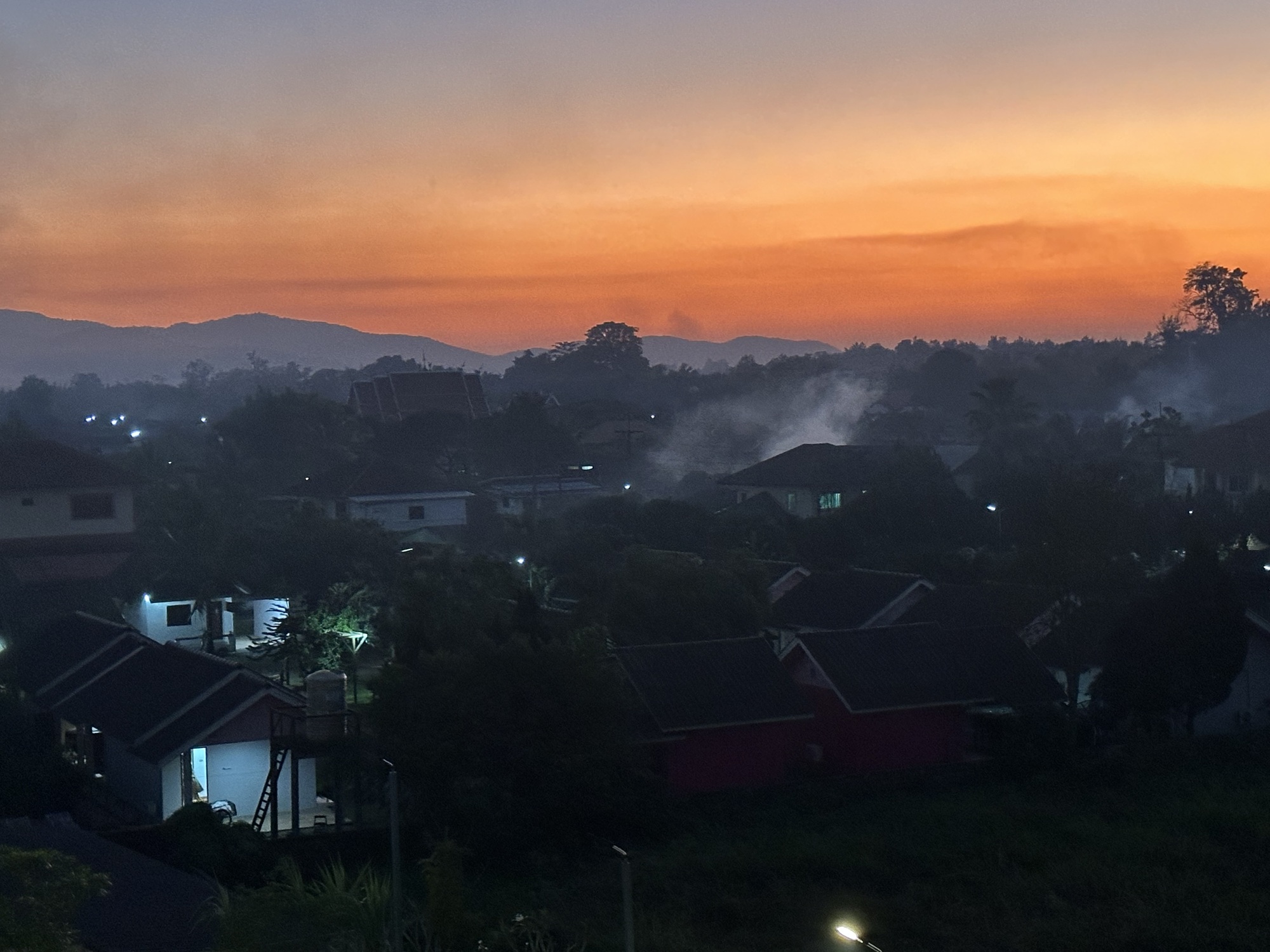 We rode to another guest house with bungalows on the edge of Chiang Kham. They were full. Then, using Google maps, we realized that every guest house and hotel in Chiang Kham was full except for a couple that were nearly $100. We don't ever spend that much. Andrea called a large, very fancy looking hotel we had passed on the way into town that we never dreamed we would ever have to consider. It had looked expensive and not our style at all. But, they had a room and it wasn't completely out of range in price so we took off again, another four miles as the sun was setting. We were racing the sun and I was thinking Silverman Outfit again but we were not going to stop to put lights on either. It was our last chance of having a bed to sleep in, what if they sold the last room before we got there.