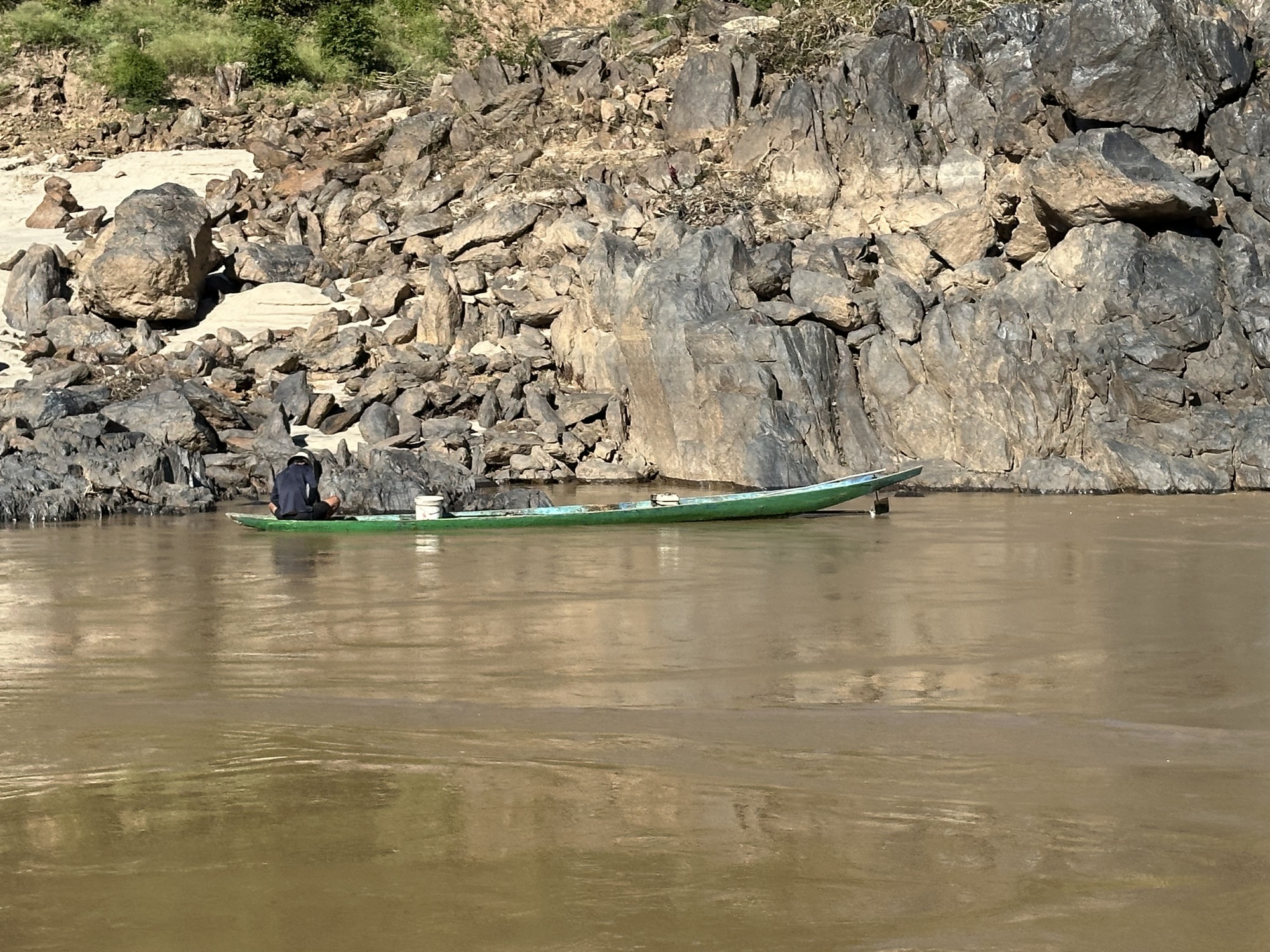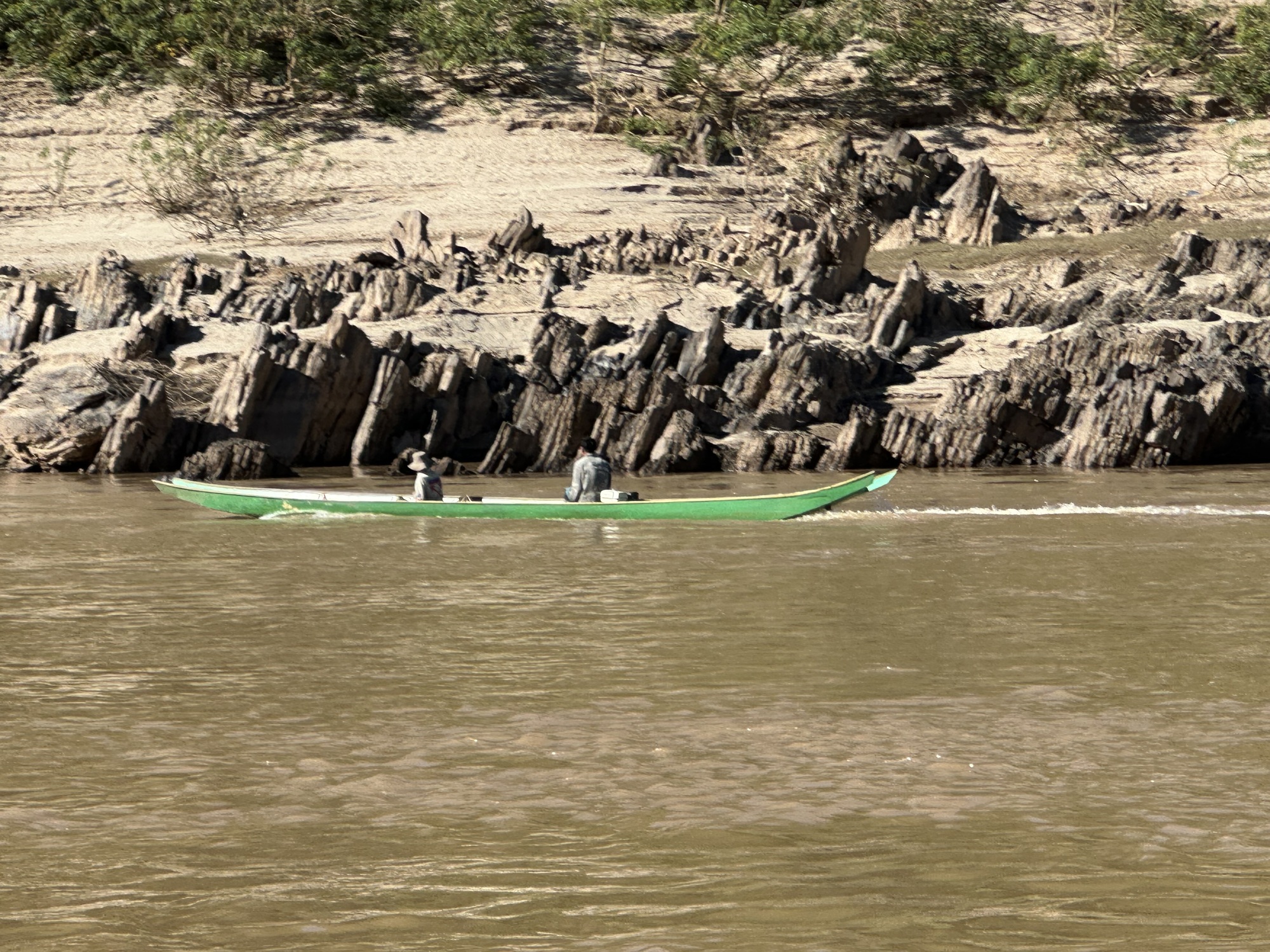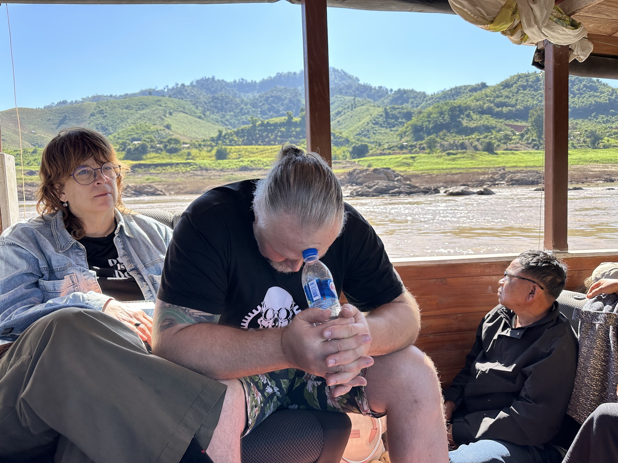 I would love to write a play about this slow boat trip. And I would love even more to stage it. There was so much going on amidst so little going on. There would be a hundred people sitting in the back doing nearly nothing but sitting there. A tiny pathway between three abreast on each side. Towards the front, on the floor a couple of steps up from the rear seated area is where the backpacker action was. Across from us would be the dead German couple, the guy periodically locking his hands over his face in despair. The Lao couple would be motionless most of the time.