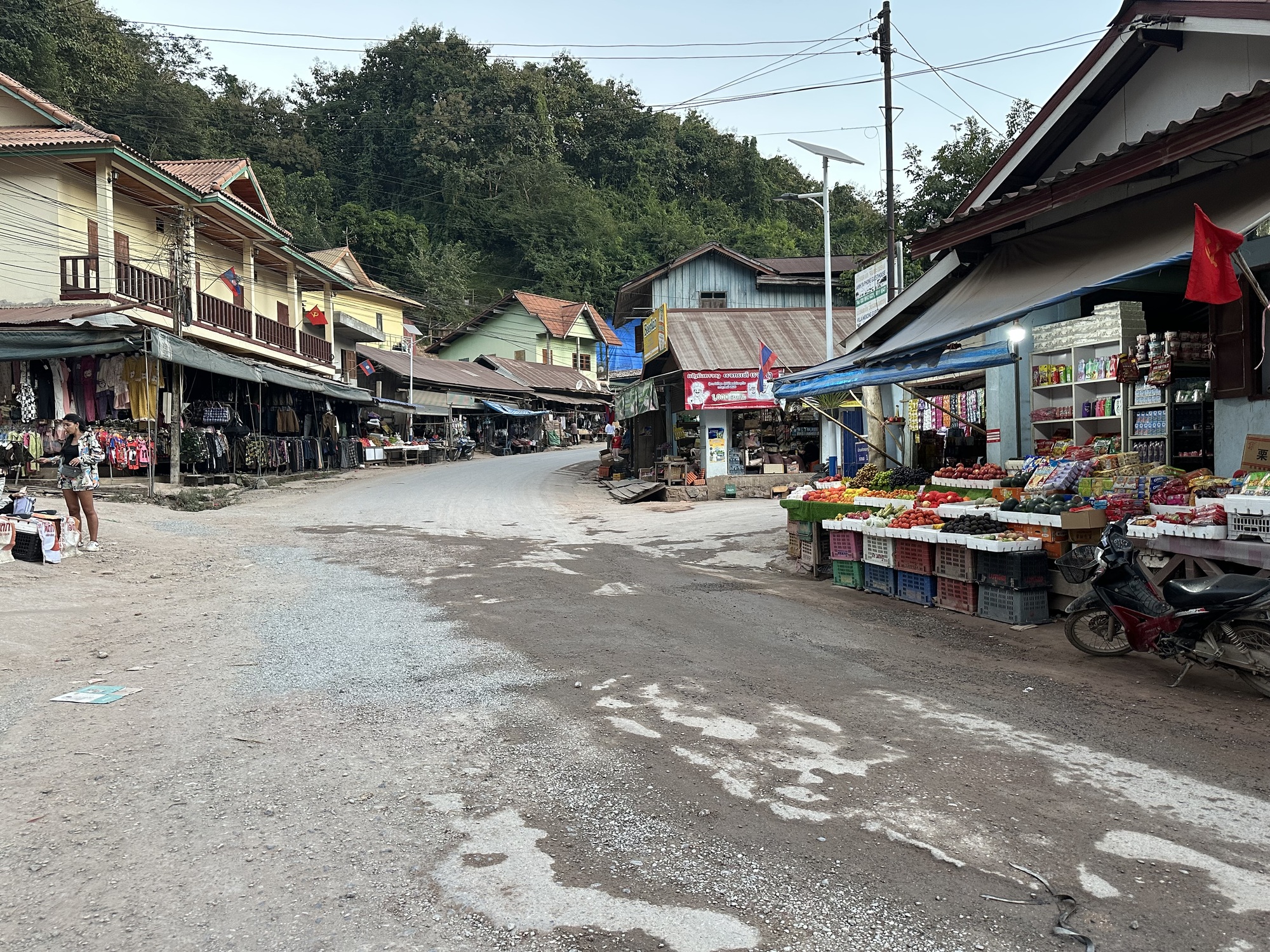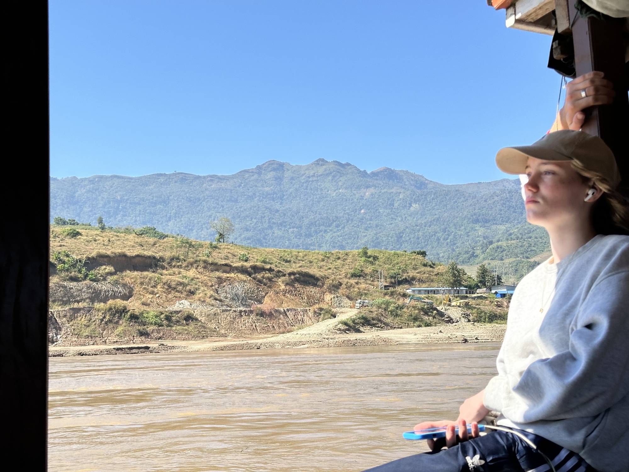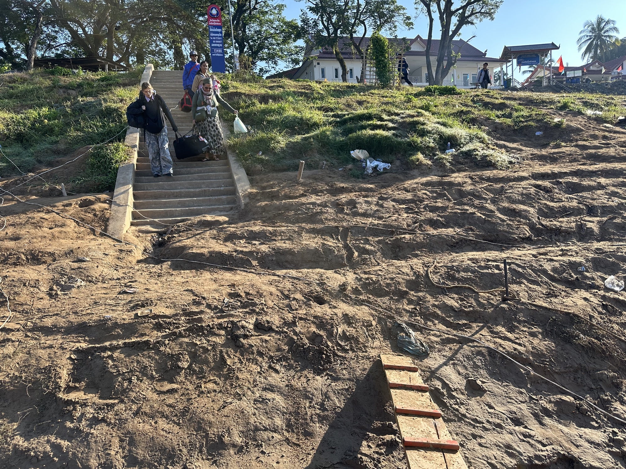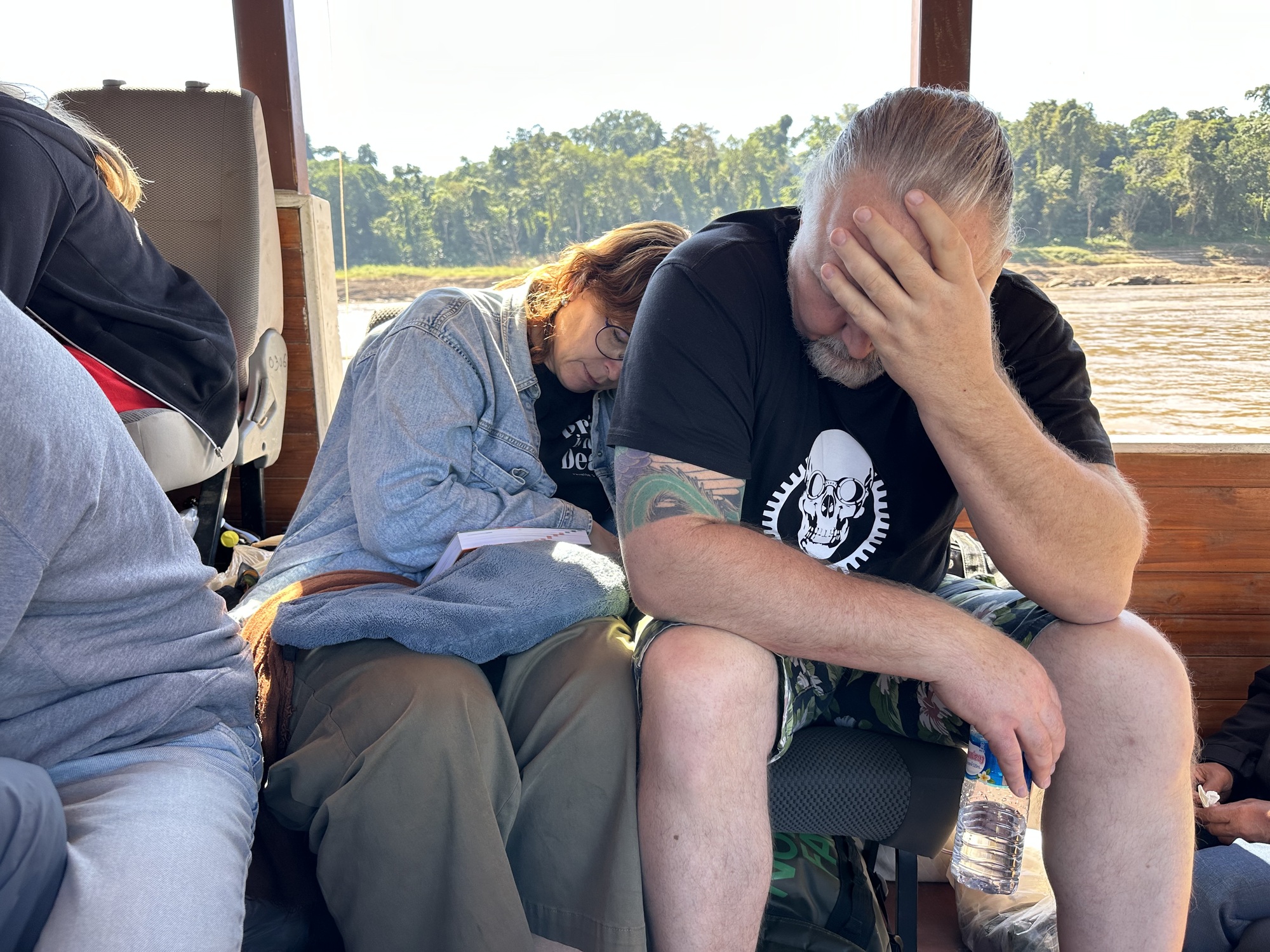 I would love to write a play about this slow boat trip. And I would love even more to stage it. There was so much going on amidst so little going on. There would be a hundred people sitting in the back doing nearly nothing but sitting there. A tiny pathway between three abreast on each side. Towards the front, on the floor a couple of steps up from the rear seated area is where the backpacker action was. Across from us would be the dead German couple, the guy periodically locking his hands over his face in despair. The Lao couple would be motionless most of the time.