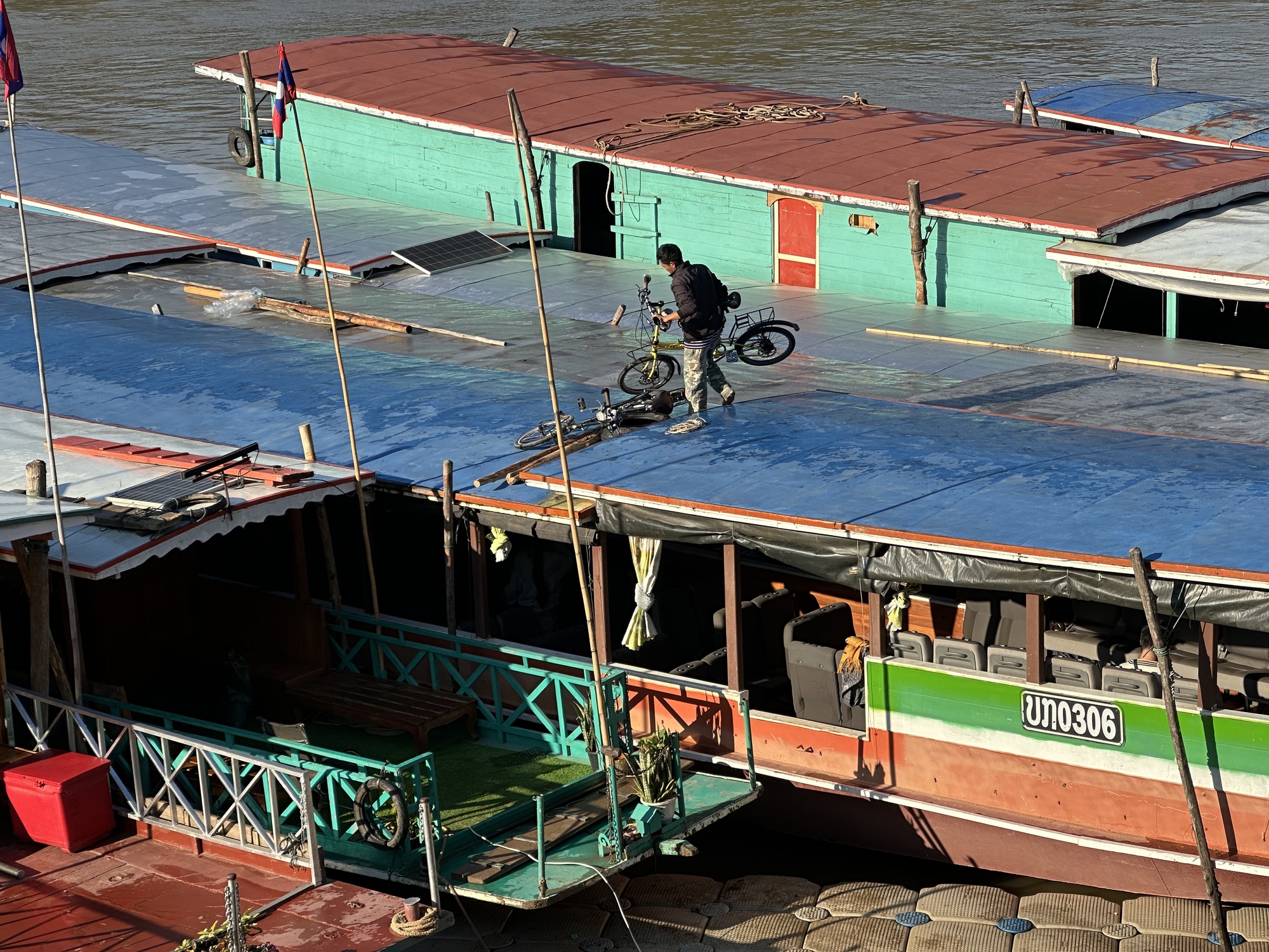 At 7:30AM we lined up at the slow boat ticket window, the only foreigners that early. We have bikes, as you remember, and we always try to iron out any possible issues transporting them might present. But there were no issues, just more money for the bike fare. $20 per person - $7.50 per bike for the two full day's ride. Not bad at all. One of the last bargains in Laos.