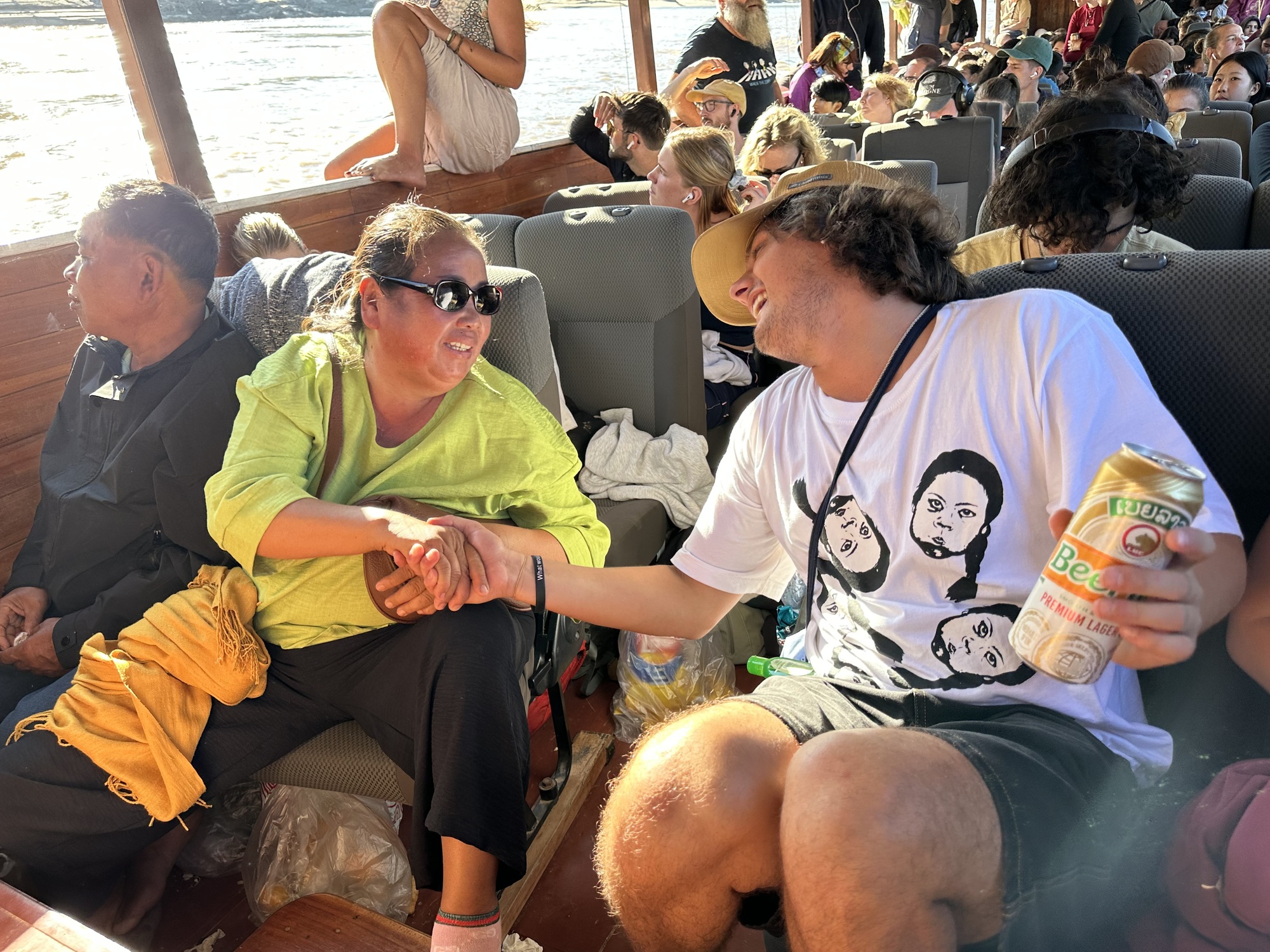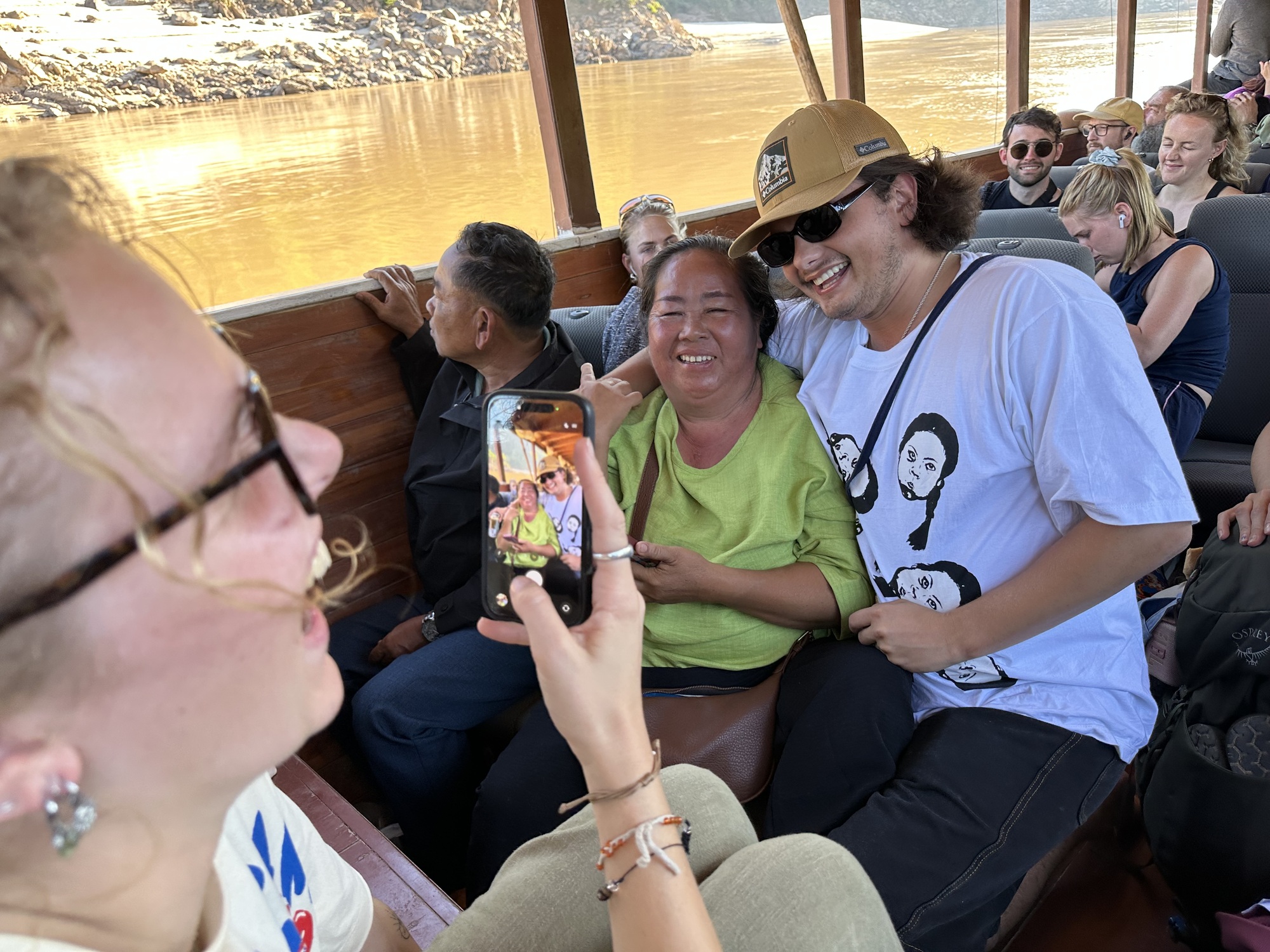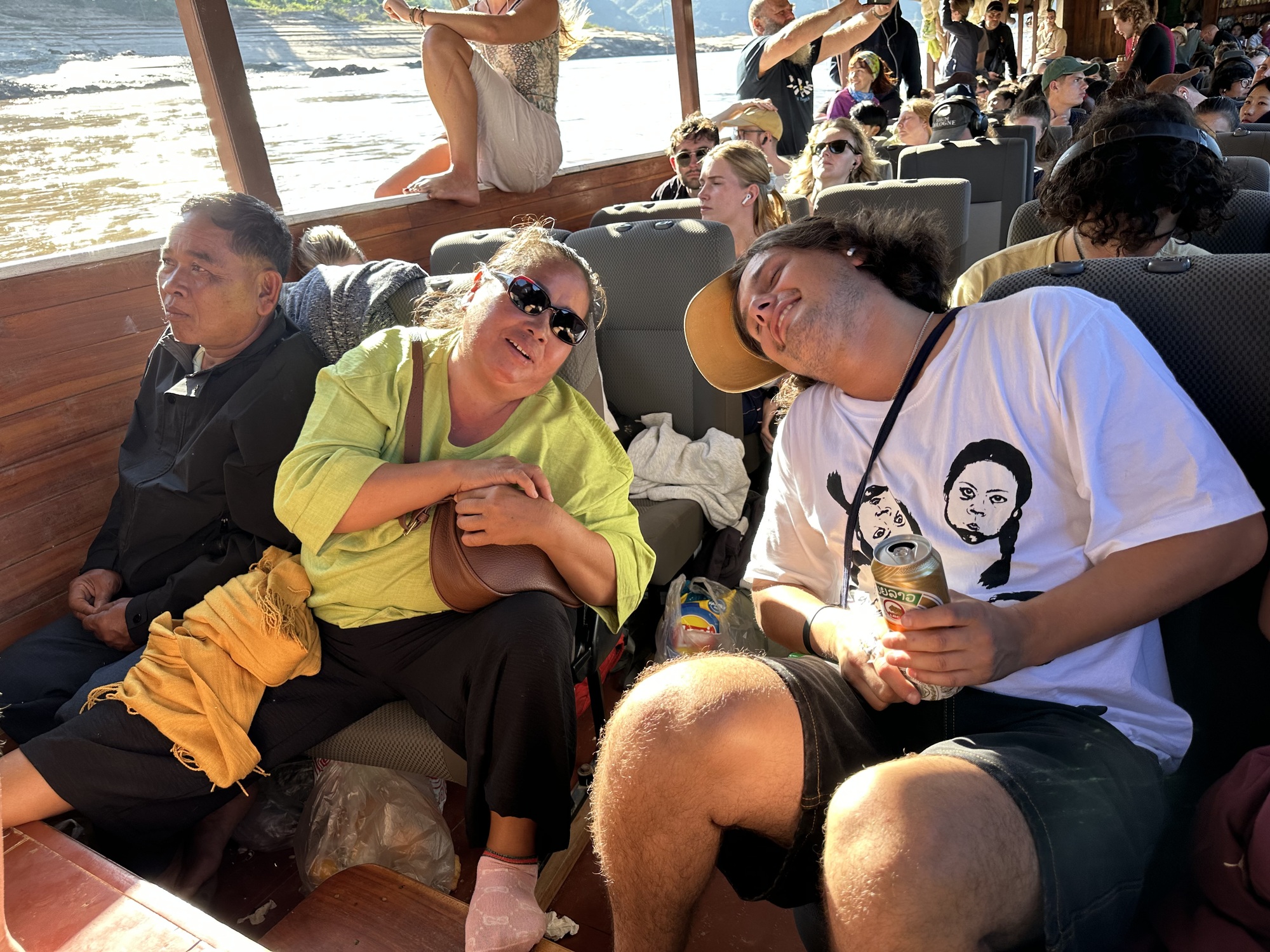 Riley woke up soon after and for some reason he took an interest in the Lao woman. He shook her hand and somehow made her smile! Then he just slipped one of his ear buds into her ear and together they were listening to his playlist! Soon she was dancing in her seat and Riley and she were laughing together and hugging. A couple of the Dutch women couldn't believe it and came over to join in the fun. The Lao woman was suddenly having a great time as well as the life of the party!! Her husband didn't want any part of her antics and certainly didn't want her getting him involved so he stuck his face out the side of the boat and acted like he was very interested in something out there. His wife, on the other hand, was having a blast with Riley and the rest of us. It was a complete turnaround in her character. Everyone was laughing, even some of the people behind were taking note and smiling. I guess we never really knew her and Riley somehow brought out her true character. We took photos, she took photos and she even wanted a photo of Andrea and myself kissing for some reason. The first two attempts were not good enough photos I guess because she kept having us do it again. Then she took photos of Riley, her new buddy. It had become an absolute riot with the Lao woman.