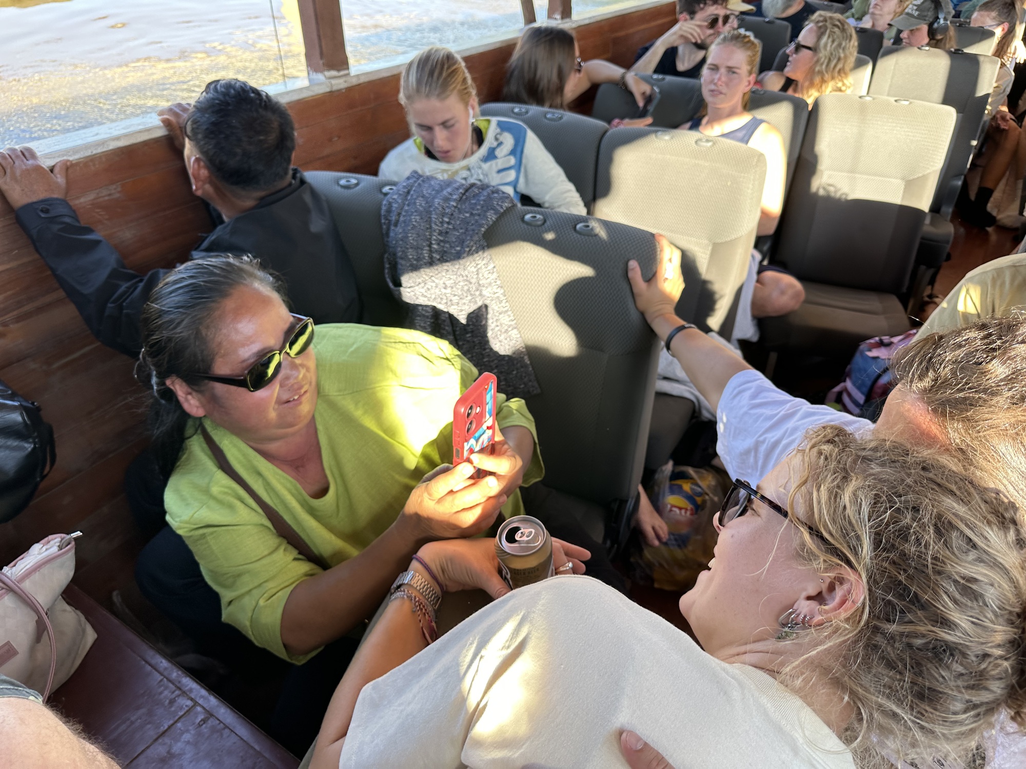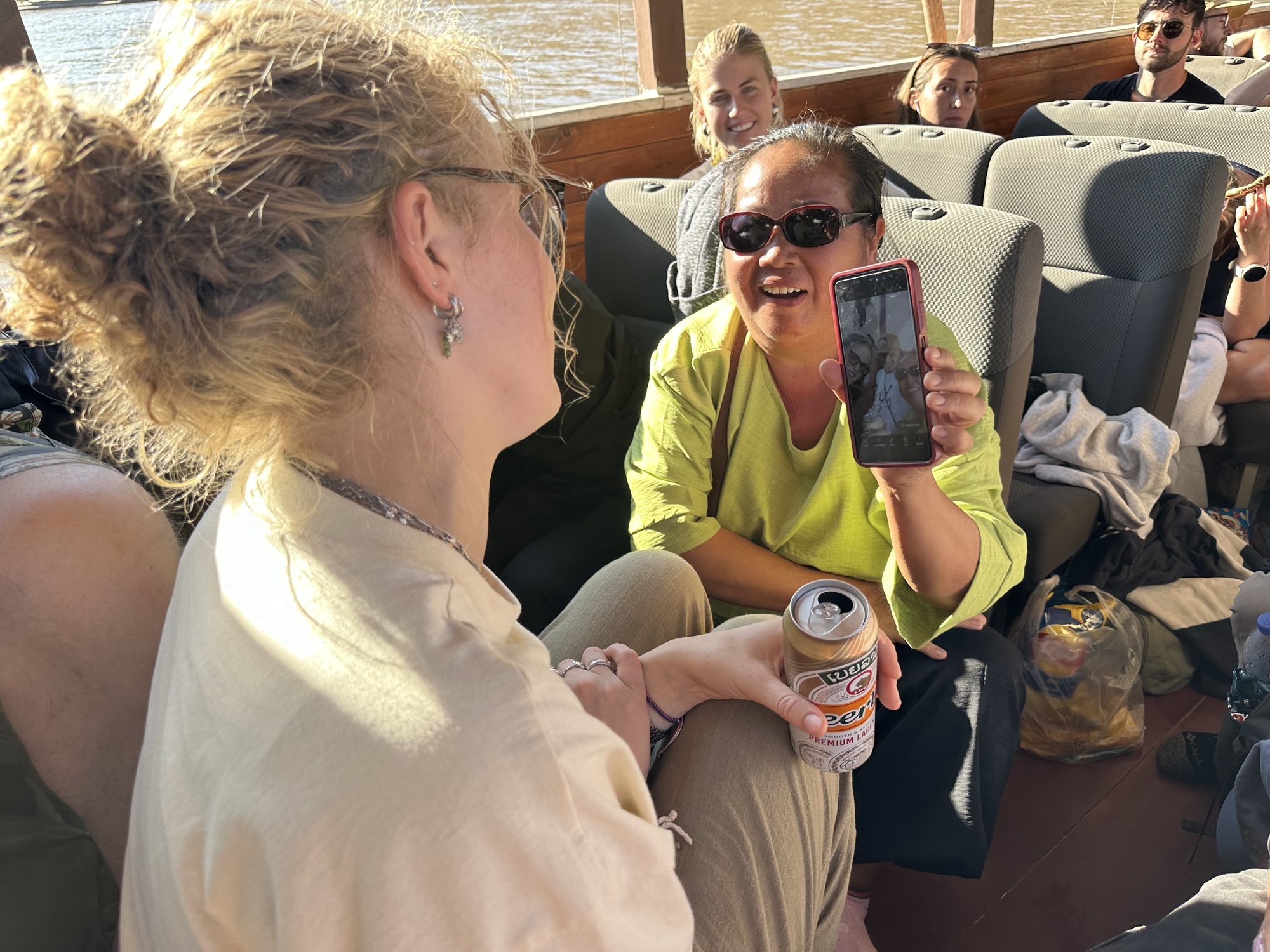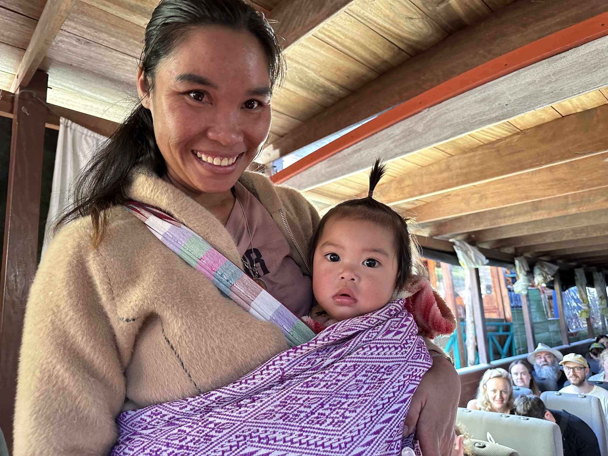 Riley woke up soon after and for some reason he took an interest in the Lao woman. He shook her hand and somehow made her smile! Then he just slipped one of his ear buds into her ear and together they were listening to his playlist! Soon she was dancing in her seat and Riley and she were laughing together and hugging. A couple of the Dutch women couldn't believe it and came over to join in the fun. The Lao woman was suddenly having a great time as well as the life of the party!! Her husband didn't want any part of her antics and certainly didn't want her getting him involved so he stuck his face out the side of the boat and acted like he was very interested in something out there. His wife, on the other hand, was having a blast with Riley and the rest of us. It was a complete turnaround in her character. Everyone was laughing, even some of the people behind were taking note and smiling. I guess we never really knew her and Riley somehow brought out her true character. We took photos, she took photos and she even wanted a photo of Andrea and myself kissing for some reason. The first two attempts were not good enough photos I guess because she kept having us do it again. Then she took photos of Riley, her new buddy. It had become an absolute riot with the Lao woman.
