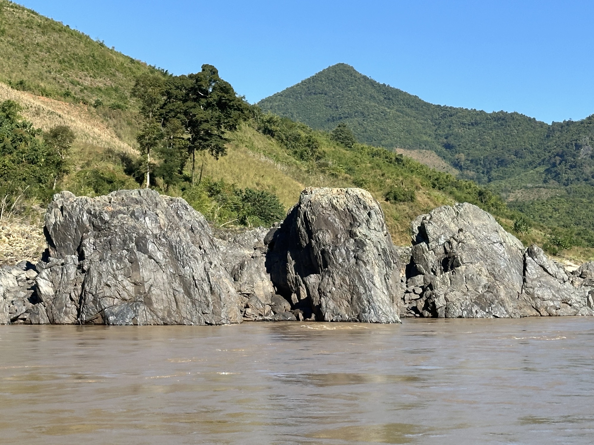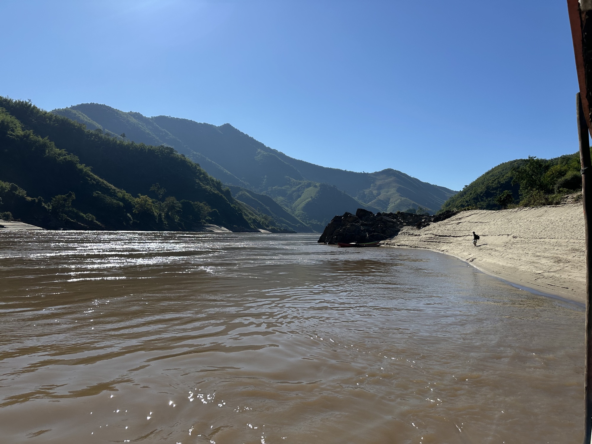 Andrea and I were watching the beautiful scenery go by. Women were washing their clothes, naked kids were jumping into the edges of the mighty river, people were panning for gold on sandbars and the boat engine strained to get through areas of nasty whirlpools and rocks. The jungle was gorgeous, everything still very green. Occasionally little wooden unpainted houses appeared from the jungle stepping up the sides of the river pagoda-like. Fishermen in their little pine needle-like boats that floated just above the waterline checked their nets on the leeward sides of huge rock faces or even on the swift current side where they also had nets strung. Groups of water buffalo frollicked on beaches looking like the happiest water buffalo I've ever seen; totally free. I don't even think they were expected to do much work since the hillsides were too steep for them. This was a land of hillside rice, not rice in paddies. There were areas of slash and burn all the way to the tops of giant hills, green with crops. The steep hillside gardens carved out of the jungle put me in awe that people worked that hard. They were not people with time to play UNO.