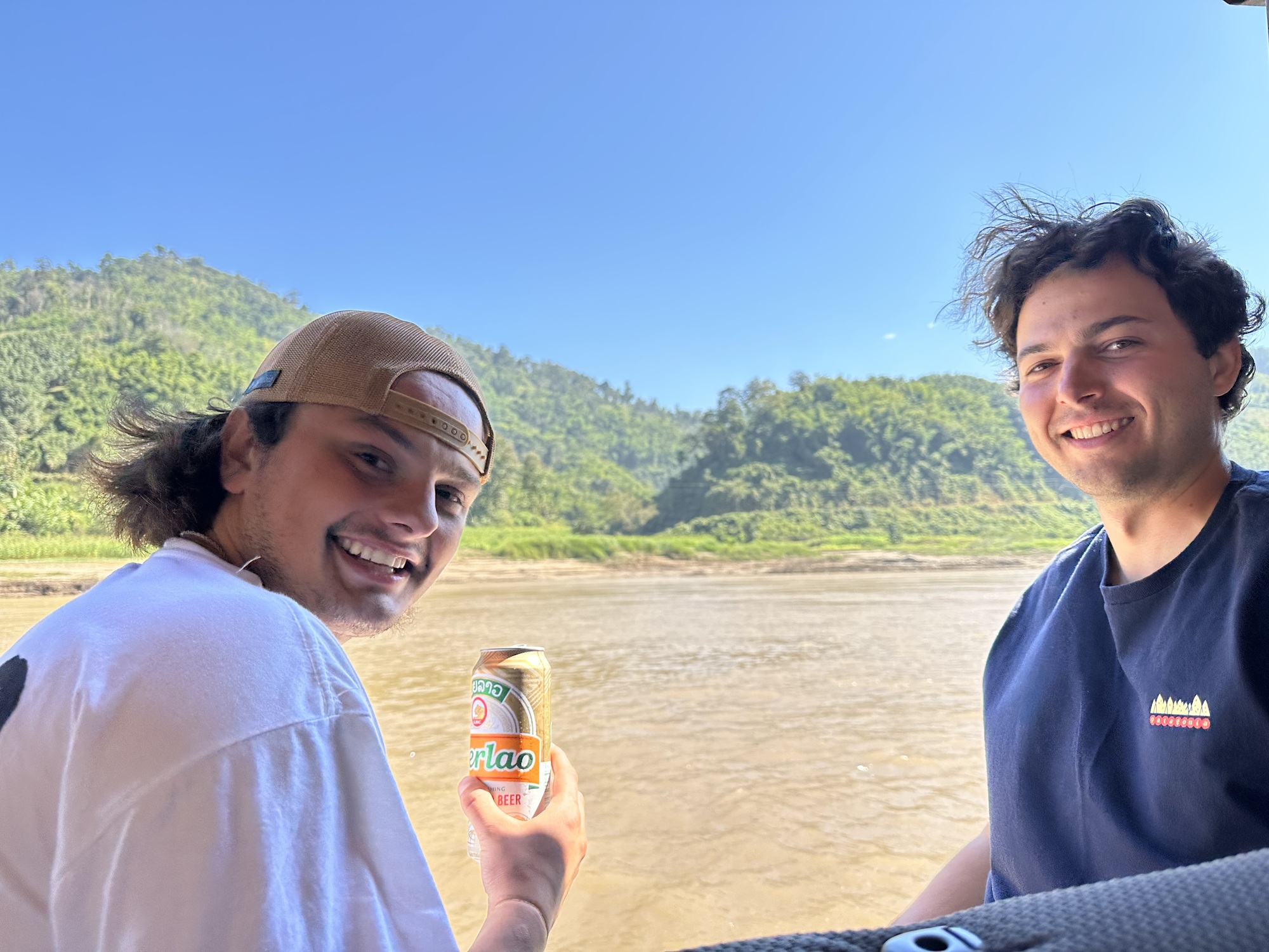 Then a miraculous thing happened. I had talked to the Canadian guy, Riley, the most and I knew he was getting quite drunk. He offered me a beer and I took him up on his offer simply so that he would have one less beer in his possession. He had been the one who had carried a styrofoam cooler onto the boat! Andrea and I split the ice cold Beer Lao and it tasted great. That's when we opened our can of Mister Potato potato chips.