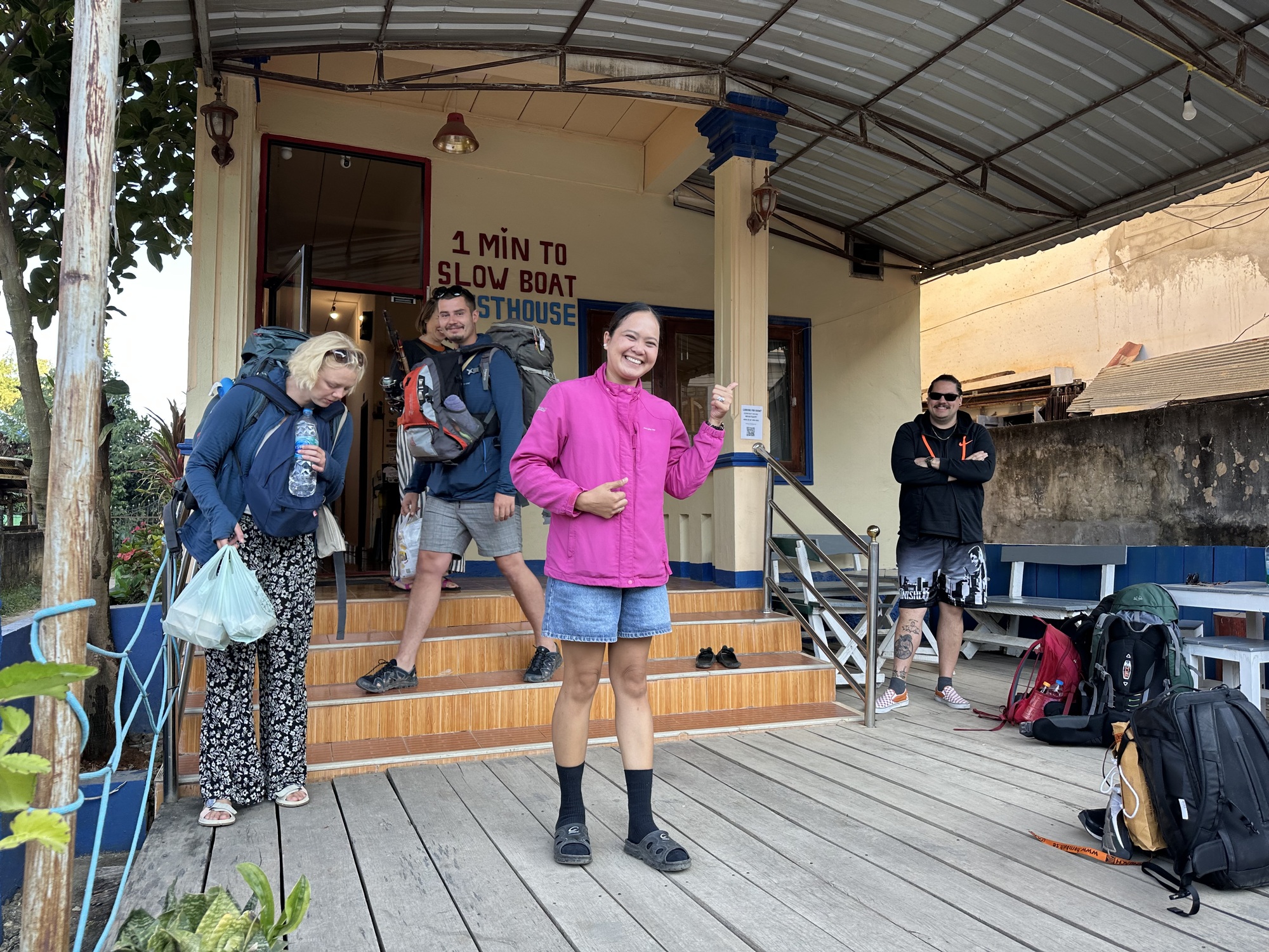 Once we had our tickets with assigned seat numbers, #12 & #13, (unusually organized), we raced up the hill to the main street of Huay Xai looking for a woman who was making khaoji pate. They are french baguettes filled with all sorts of meats and sauces which you don't really want to watch being made or you might back out of the whole idea. We have never gotten ill from khaoji pates and they are the perfect food to take on the boat to make it a true Lao slow boat experience. Then we quickly walked back to our hotel which was called, and I'm not kidding, "One Minute to Slow Boat Guesthouse." It was by far the nicest, cleanest and best-run guesthouse we have ever stayed at in Huay Xai. I noticed on the front desk that they sold little round Lao Slow Boat stickers which I had to have to slap on my bike frame and then we were off down the hill to the boat for yet another slow boat adventure.