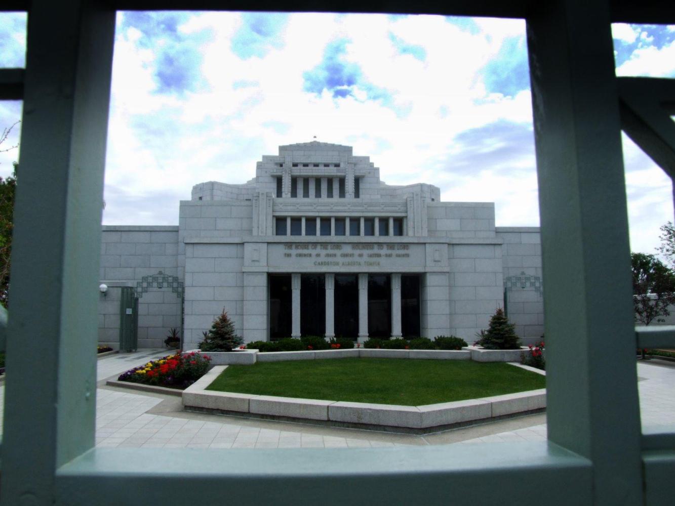 beside the road, curiously unsignposted in a town that is 80 per cent Mormon, and the neighbouring building has a mural depicting his journey north. A big white block of a Mormon temple overlooks the town but we weren't allowed inside.